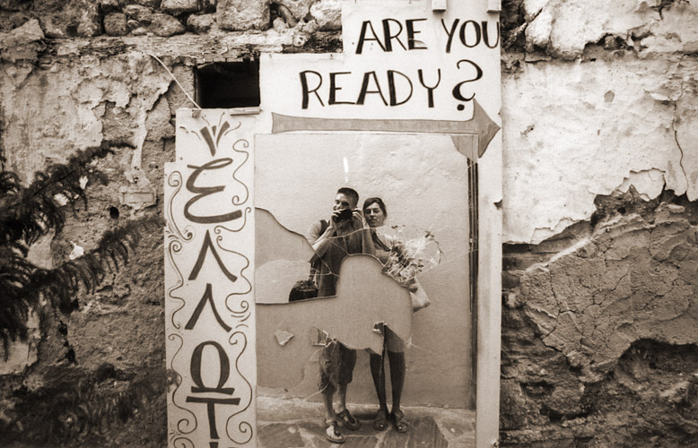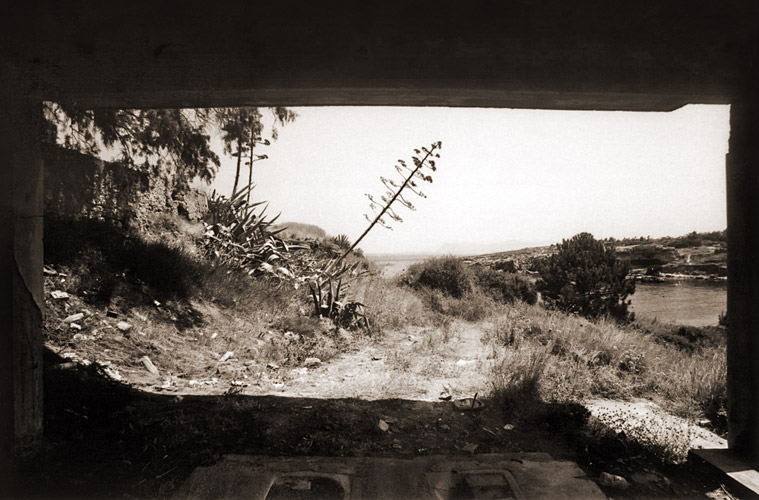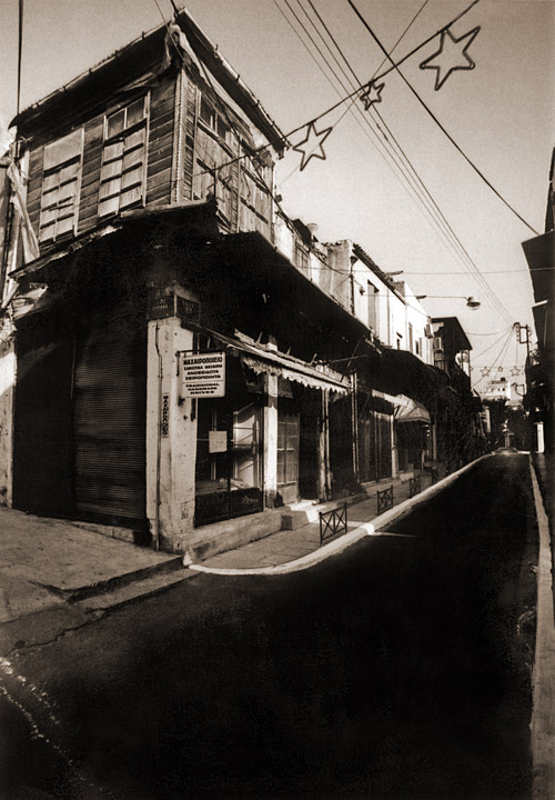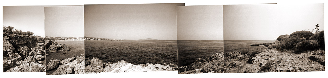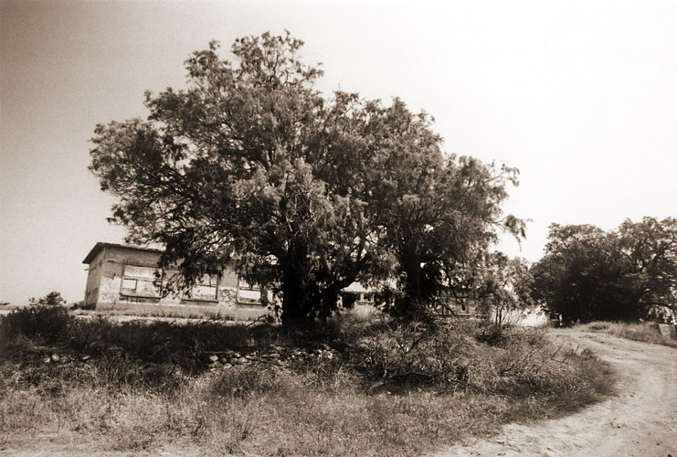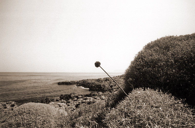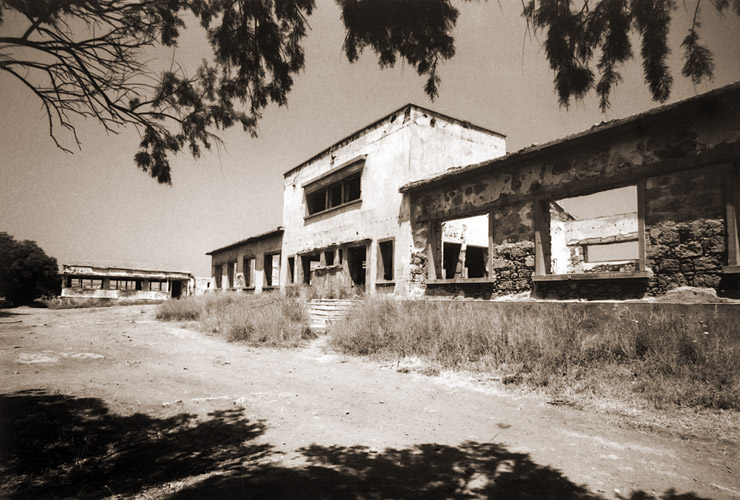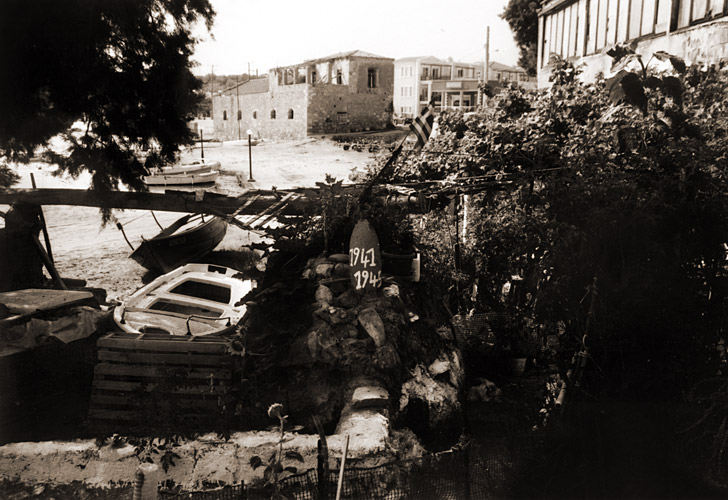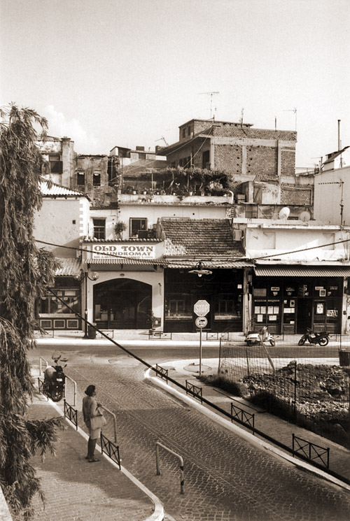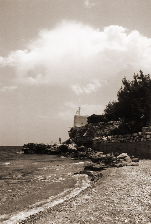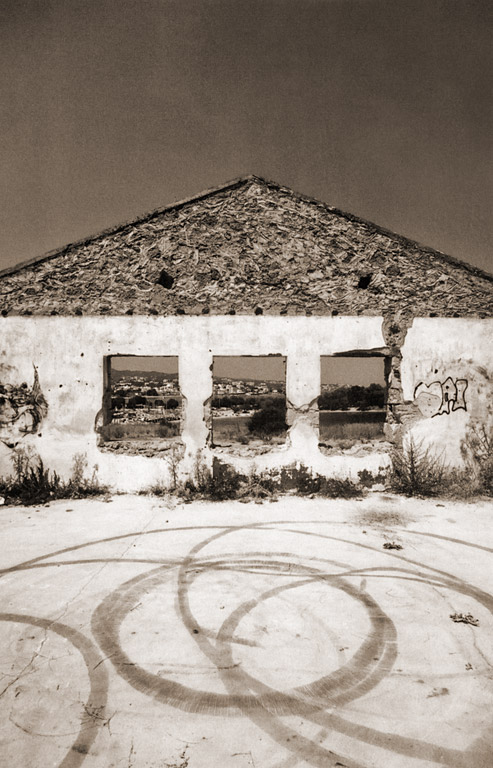 Összesen 93 kockát exponáltam, ezeknek több mint felét (ötvenet) elsején, egy magányos fotótúrán, a tikkasztó hőségben, egy flakon hideg (és egyre melegebb és kevesebb) ouzo-s víz kíséretével. Kalamaki (a szálláshelyünk) közelében rátaláltam egy elhagyott, romos épületre – itt csattogtattam a legtöbbet. A hely különös szépsége az volt, hogy senkit nem láttam a közelben, de az ablakok helyén át látszott a néhány száz méterre levő, turistákkal elárasztott tengerpart.