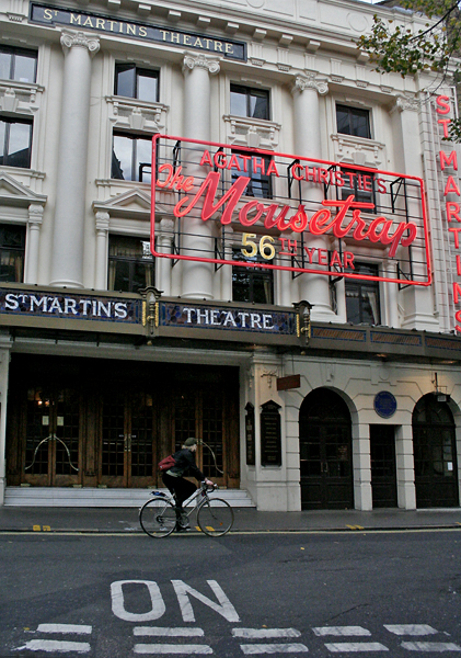 pár újabb fotó: az elsőn az a színház látszik, ahol 1952 óta folyamatosan megy az Egérfogó, Agatha Christie híres krimije. eddig mintegy 23ezerszer adták elő, és minden alkalommal megkérik a közönséget, hogy senkinek ne árulják el, ki a gyilkos. a bicikli a Tate modern előtt várta gazdáját.