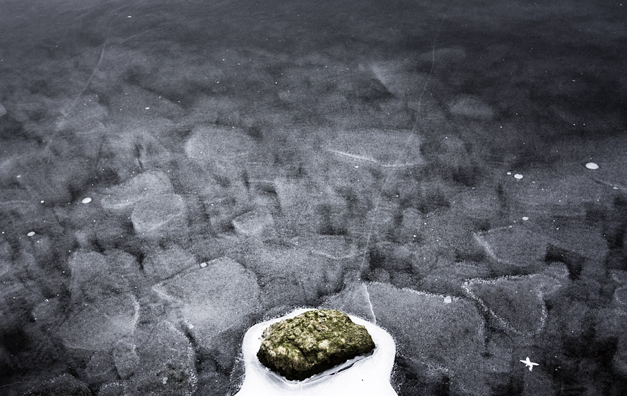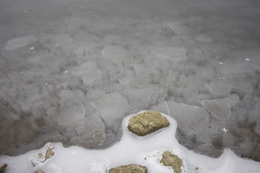 Na de térjünk vissza a fotóra: arra emlékszem, hogy baromi hideg volt, és hogy fotós szemmel némi csalódást okozott a helyszín, amit hagyományosan Béla választ, és ami ezúttal egy Pilisvörösvár környéki tó volt. Szokatlanul keveset fényképeztem, mindössze 23 fotó őrzi e túra emlékét. De azért téma ugyebár mindenhol akad, ebben az esetben egészen érdekesnek tűnt a víz alatti kövek mintáját közvetítő jég textúrája. Némi part menti követ hozzákomponálva pedig már majdnem elégedett voltam az eredménnyel. Maradék hiányérzetem persze csak a számítógép előtt ülve, a fotó adjusztálása után múlt el: a képet először is megvágtam, állítottam a színhőmérsékelten (-750 > 5000), az expozíción (-0,38), a szaturáción (-40), keményítettem, kontrasztosítottam, elsötétítettem a széleket (vignettálást adtam hozzá) és végül még külön visszavettem a kék szaturációjából is.