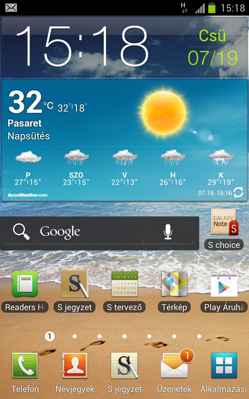 Utóbbi miatt ki is hívtam a szervizt (erről majd a következő bejegyzésben) – és mivel a 4-es Androidra történő frissítés után meglehetősen be is lassult a telefonom, teljesen legyalultattam. Így néz ki alapból a gyári nyitóképernyő – már el is felejtettem, milyen gusztustalan volt, mikor megkaptam…