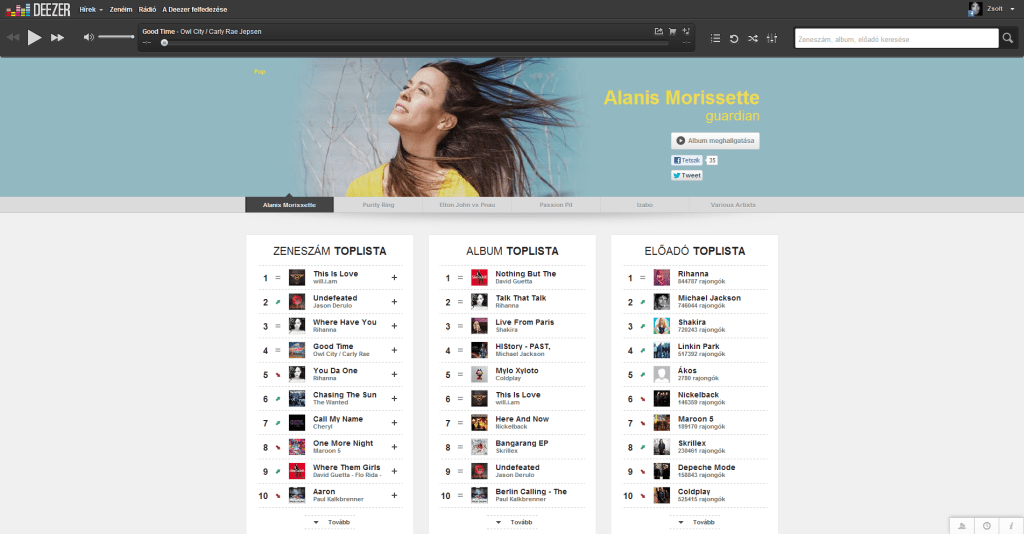 Nagyjából négy hónapja találtam rá a Deezerre – elsőre megfogott a gazdag zenei kínálata (jelenleg 18 millió szám) és a felhasználóbarát felülete. Két hónapja előfizettem a korlátlan zenehallgatást kínáló Deezer Premium csomagra havi 3,49 euróért (kb. 1000 Ft), amit egyáltalán nem bántam meg. RSS-ben követem az est.hu friss lemezkritikáit, eddig még nem nagyon volt közötte olyan anyag, amit ne tudtam volna meghallgatni a Deezeren. A Deezer magyarul is beszél, és vannak mobil alkalmazásai is (iOS + Android) – ha érdekelnek további részletek, fedezd fel!