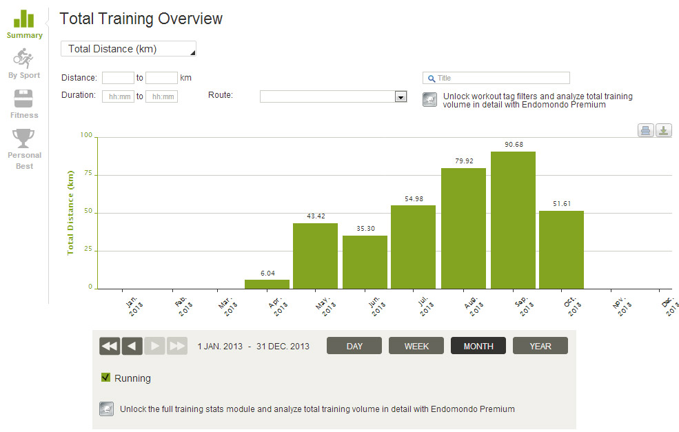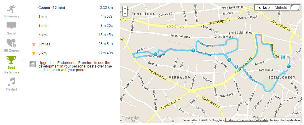 Az alábbiakban pár képernyőfotó látható a saját Endomondo profilomból, ami egyébként bárki számára böngészhető (mert mindent az alapértelmezett publkikus beállításon hagytam – megnézheted, mikor merre futottam, vagy akár azt is, hogy milyen zenéket hallgattam közben). Részletes adatok csak szeptember 12-től vannak, ekkortól használom az Endomondo androidos alkalmazását; a korábbiakat manuálisan vittem fel a My Tracks táblázata alapján (melyben sajnos nem minden futásom szerepel).