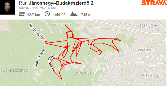Visszatértem tegnapi Lucás kirándulásunk helyszínére – a tegnapi napsütésben szebben pompáztak az őszi színek, mint ma, a szemerkélő esőben, de panaszra nincs okom. A fákon már alig van levél, a frissen hullott avarban hatalmas zajt keltettek a lépteim. A turistautak.hu-ra ráférne már egy frissítés – ma is elvezetett egy olyan alig járható helyre (szándékosan nem utat írtam, mert nemhogy turista, de semmilyen nem volt), ahol magamtól csak nyúlként futnék. És itt láttam is egy igazit, amint a gyakorlatban prezentálja, milyen könnyen megy neki. Aztán meg jártam olyan meredek terepen, hogy meggörnyedve az orrom majdnem a földet karcolta. Ez volt eddigi leghosszabb futásom – már ami az időt illeti (és egyben a legfárasztóbb, a legnagyobb szintemelkedéssel).