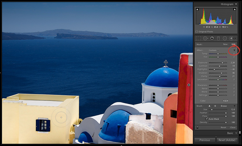 A Lightroom Killer Tips oldalán találtam egy hasznos tippet, mely által adott lehetőségre eddig fel se figyeltem; mivel nem vettem észre a helyi módosító eszközöknél (Adjustment Brush, Radial Filter, Graduated Filter) a jobb felső sarokban megjelenő kis háromszöget (a kép forrása: lightroomkillertips.com):