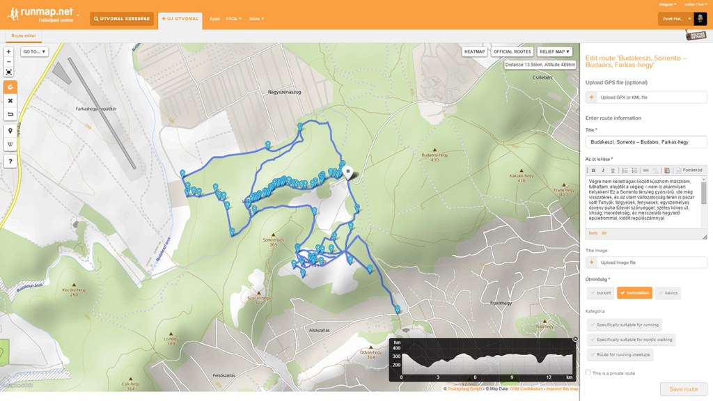 A futásaim dokumentálásához használt Endomondo sajnos nem ismeri a turistautakat (ez [is] egy igen nagy hiányossága – bár folyamatosan fejlesztgetik, arra gondosan ügyelnek, hogy ez ne érintse a lényeget: a felhasználóbarát kezelést). Ezért régen úgy terveztem meg a futóútvonalaimat benne, hogy a turistautak.hu-ról lesve, próbáltam belőni az Endomondo térképén, hova is kell raknom a pontokat. Nem volt egyszerű – pláne nem gyors. Aztán egy kollégám megmutatta a Bike Route Toastert, melynek turistautakat is tartalmazó térképére kényelmese(bbe)n rajzolhattam, majd az innen exportált GPX fájllal etettem meg az Endomondot (előbb új, már lefutott útként importálva, aztán abból útvonaltervet mentve).