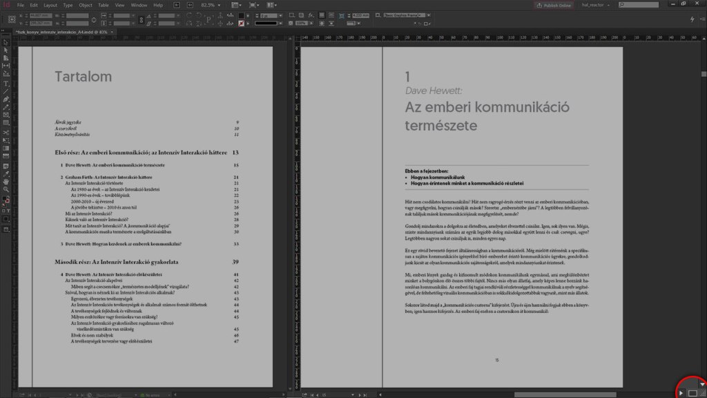 Az, hogy több mint négy éve írtam le utoljára a blogomon a címbéli szóösszetételt, nem jelenti azt, hogy ne emlegetném gyakran. Legutóbb akkor, amikor egy könyv szerkesztésénél merült fel bennem az igény arra, hogy ugyanazt a dokumentumot nézzem két ablakban – konkrétan a tartalomjegyzéket szerettem volna ellenőrizni az oldalak közti ugrálás nélkül. Már elkezdtem kutatni a Navigator panel után, de rövid internetes keresés után kiderült, hogy ez már a CS5-ös verzió óta nem létezik (helyette ajánlják a Power Zoomot). Viszont a megoldás ott volt a szemem előtt, a jobb alsó sarokban, csupán egyetlen klikkre (lásd a képen).