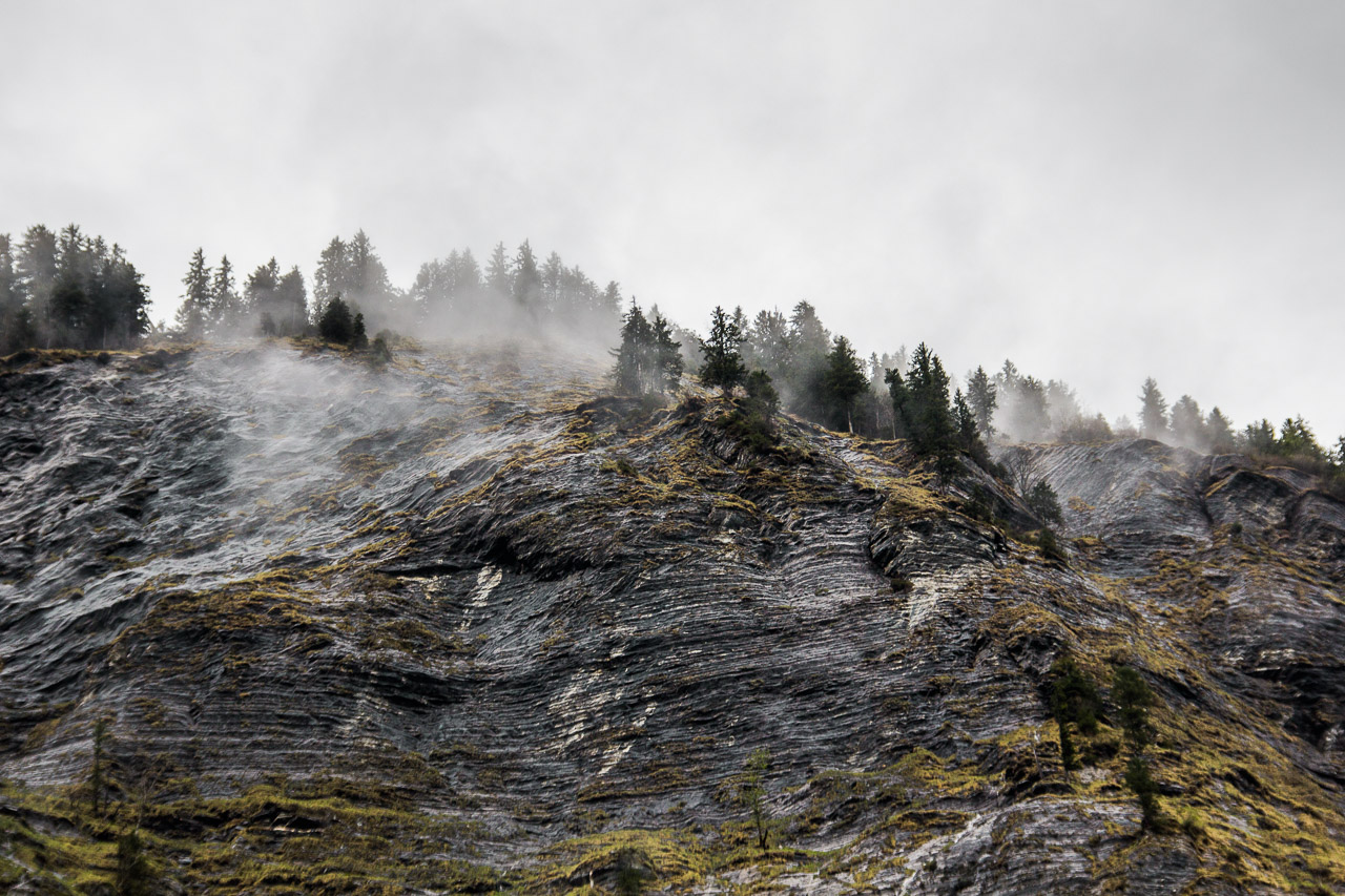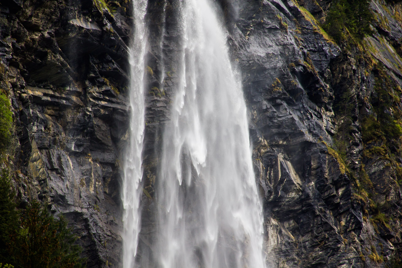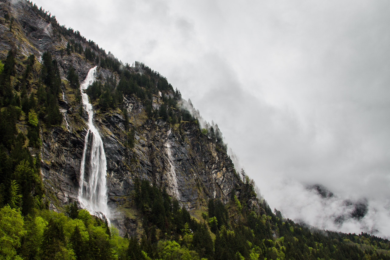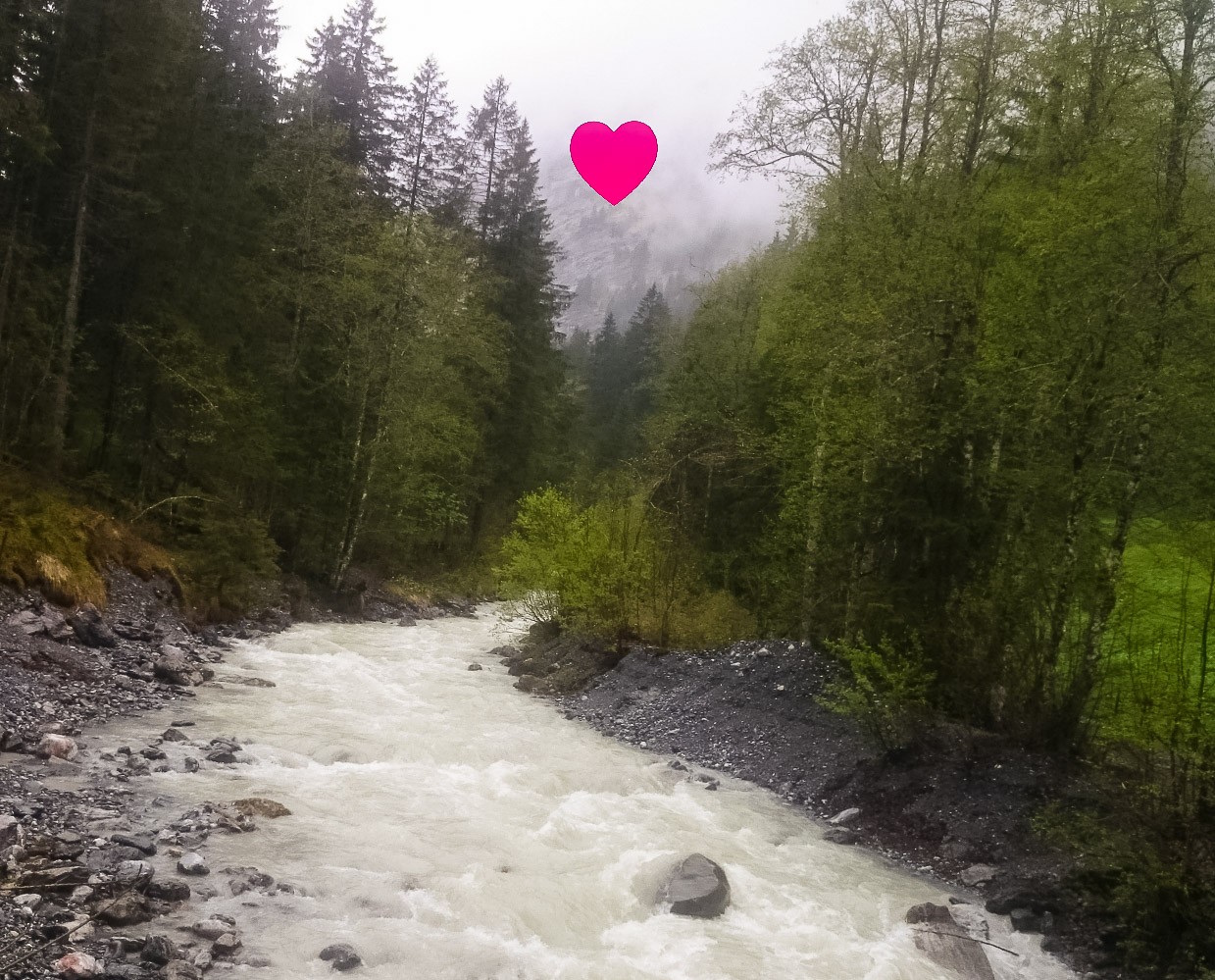 Ezen a napunkon esett a legtöbb eső, mégis ezen a napon fotóztam a legtöbbet – hisz ismét meglehetősen fotogén helyeken jártunk –, és talán ezért is utoljára a hat éves tükörreflexesemmel, ami végleg felmondta a szolgálatot a nedves környezetben. De akárcsak Korzikán az állványom elvesztése, itt Svájcban a fényképezőgépem kipurcanása is felszabadító élmény volt – ismét eggyel kevesebb kacat van az életemben (erről részletesen majd egy későbbi bejegyzésben). A szívecskés képet önállóan készítette a nedves zsebemben csúszkáló (vízálló) telefonom – rögtön utána pedig következik egy vízeséses kép, ami az utolsó fotóm a Canon 550D-vel.