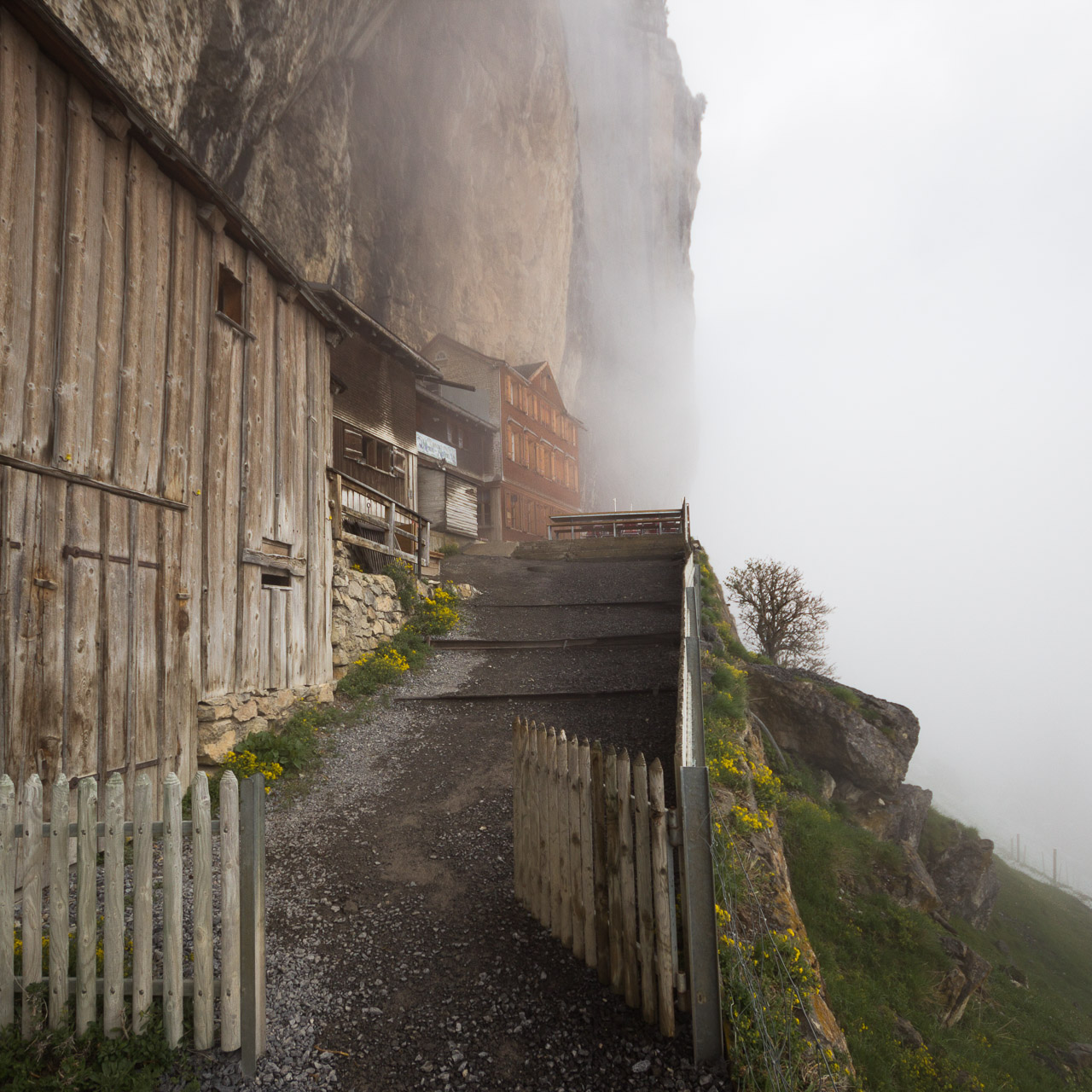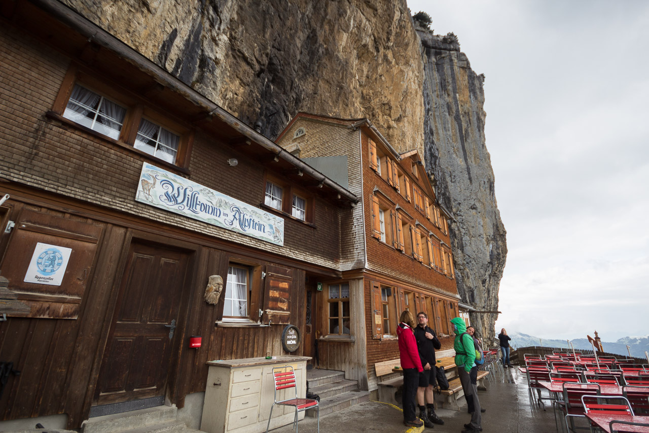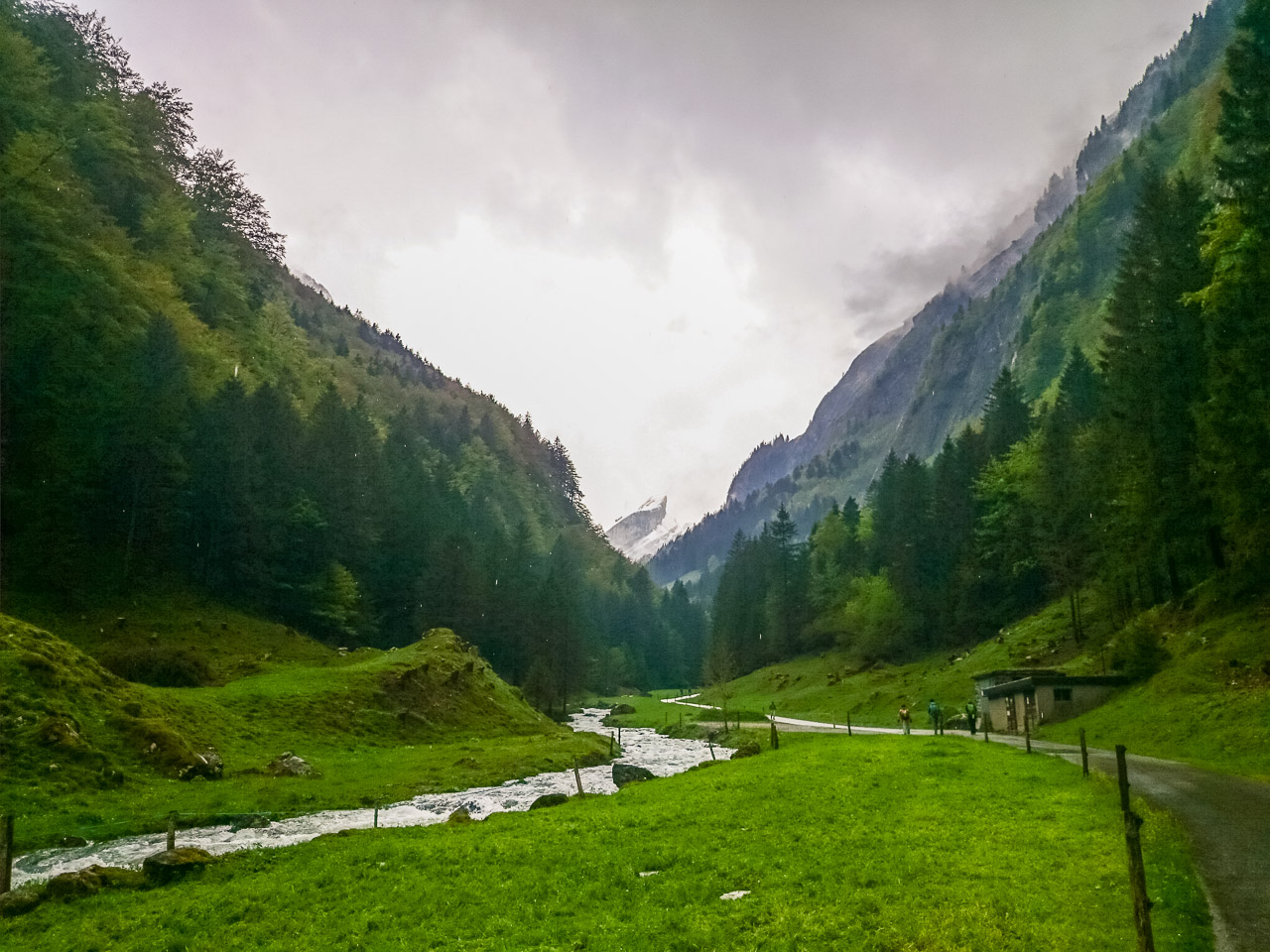 Harmadik svájci napunk részemről egy nagyszerű futással indult. A szállásunkra visszaérve tettem még egy próbát az előző napon „elázott” fényképezőgépemmel, de hiába. De nem maradtam „nagygép” nélkül egy kedves túratársunk jóvoltából: egy kölcsönkapott Canon 600D gombjait nyomkodhattam-tekerhettem a lenyűgöző Aescher Hotelhez vezető túránk során (legalábbis amikor nem féltettem elővenni az esőben – ilyenkor inkább a vízálló mobilommal fotóztam). Ezúton is köszönet érte!