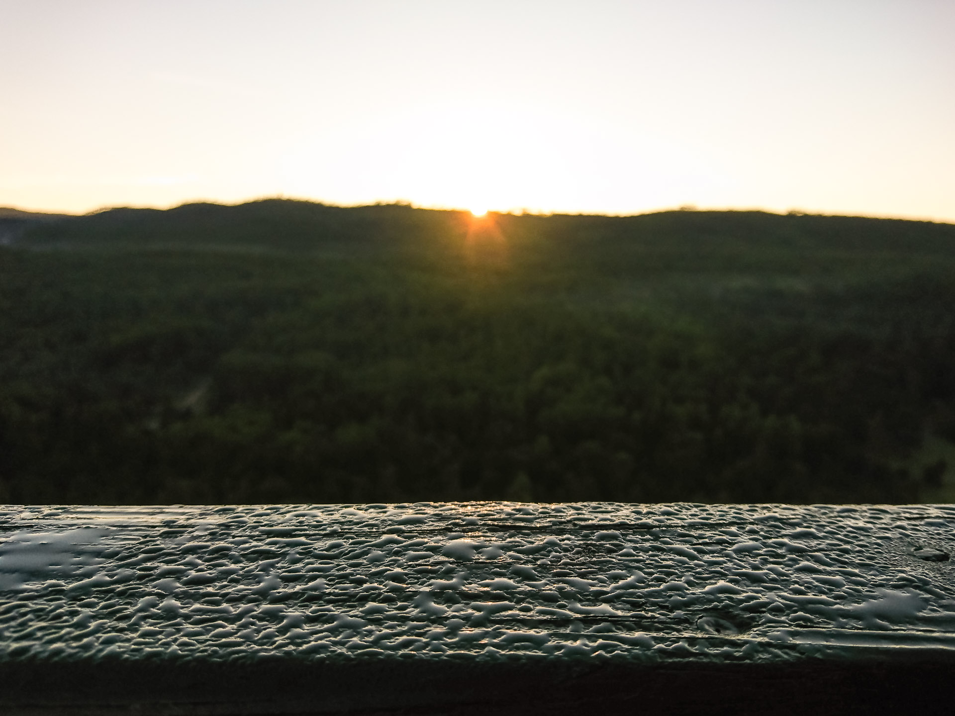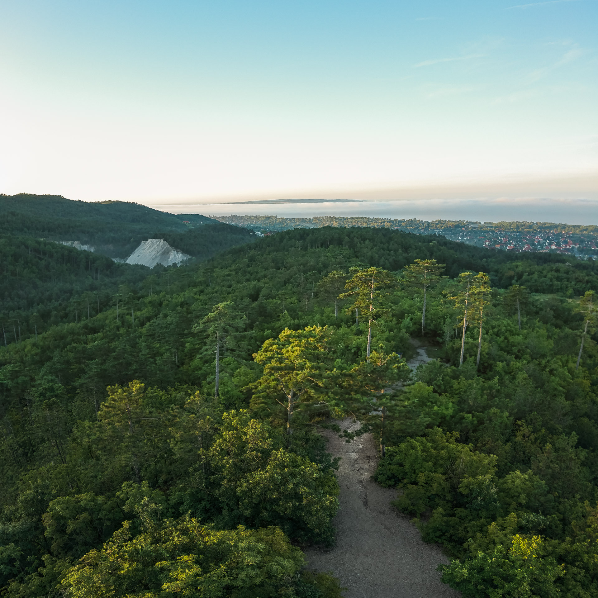 A Festetics kilátó tetejére érve máris alaptalanná válik „aggodalmam” – a hegy mögül felbukkanó Nappal szemezve csodálom a táj sokféleségét: a még árnyékos erdőt, hátterében a köddel takart területeket, és a napsütötte holdas eget.