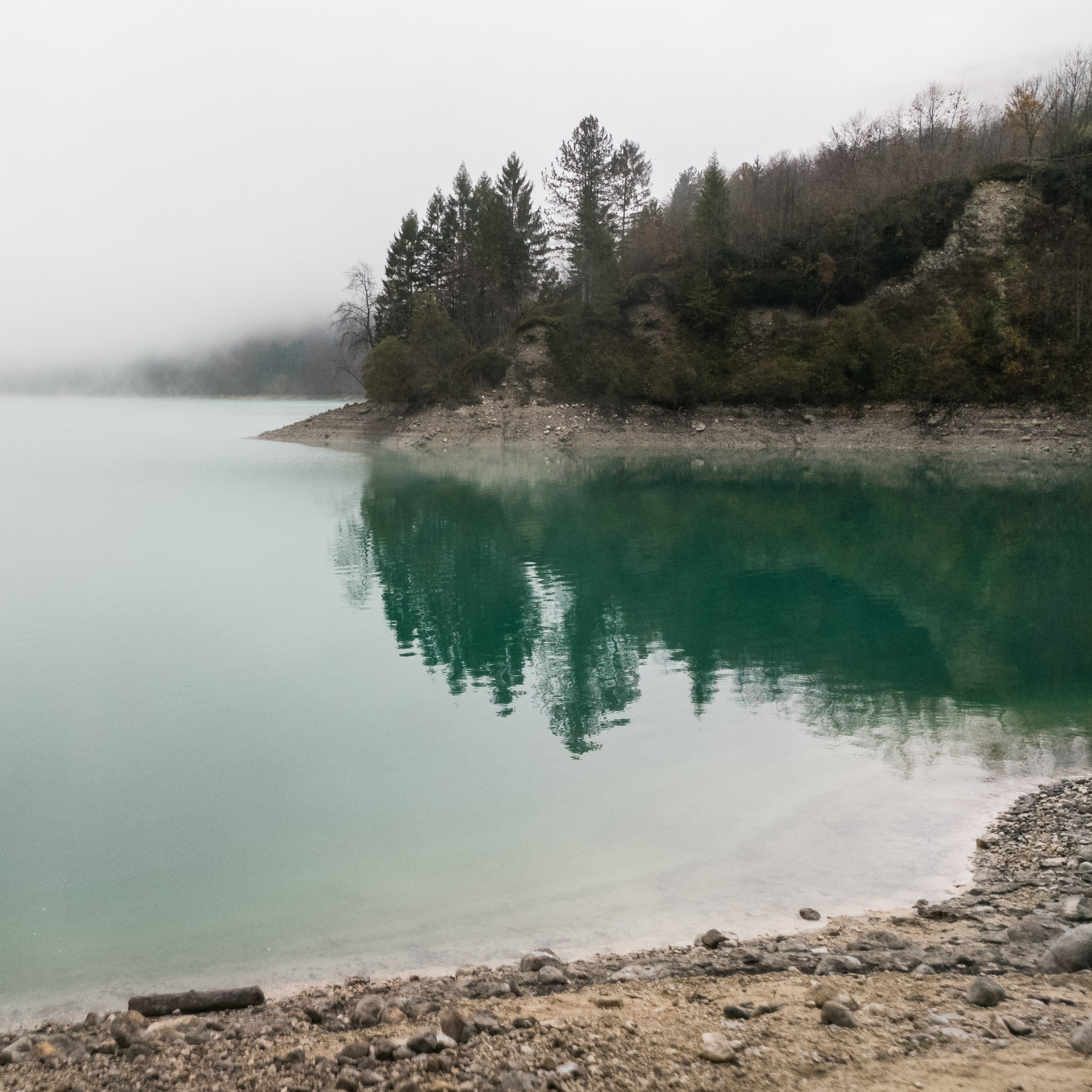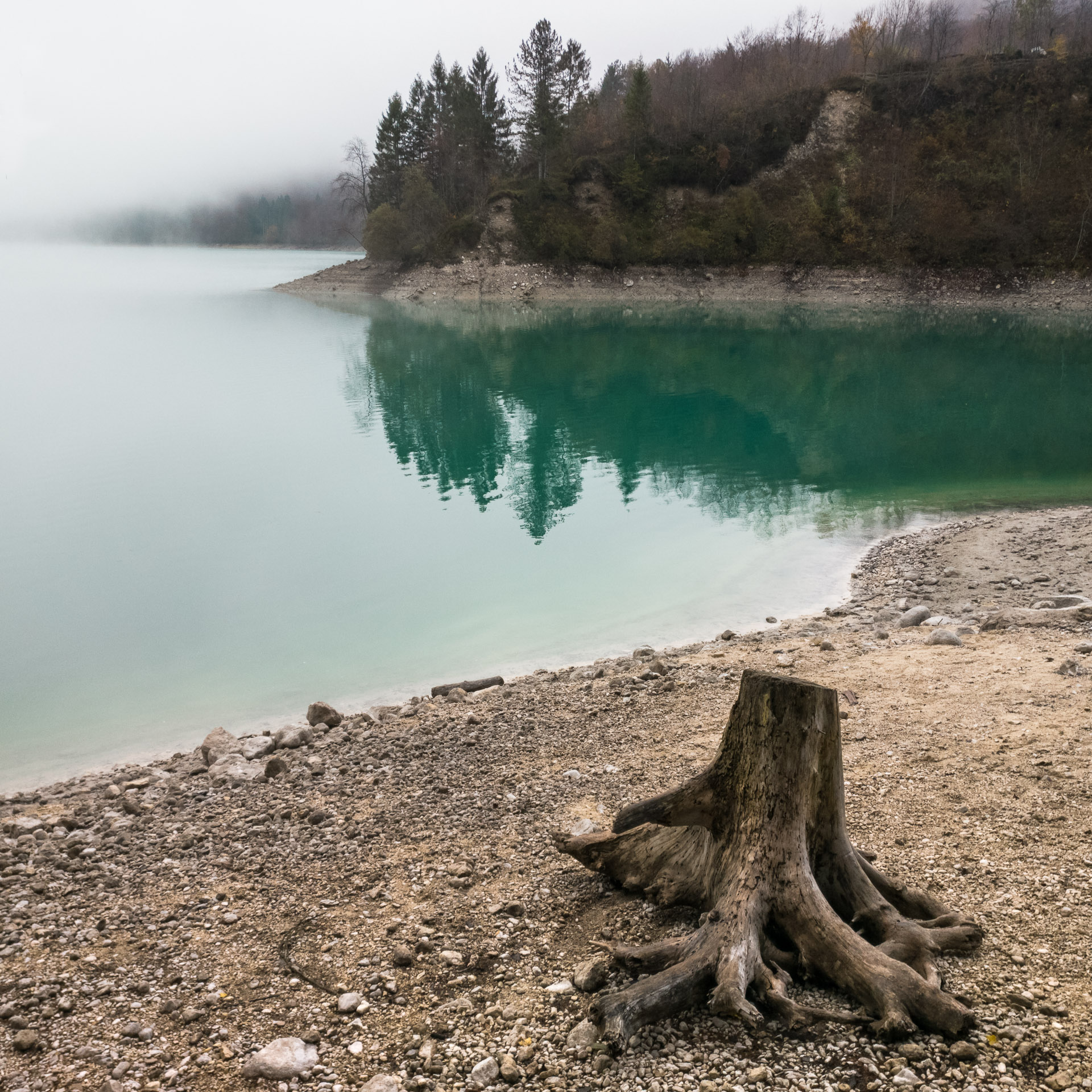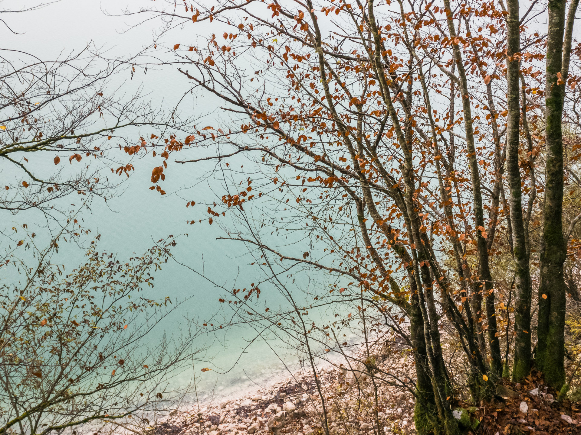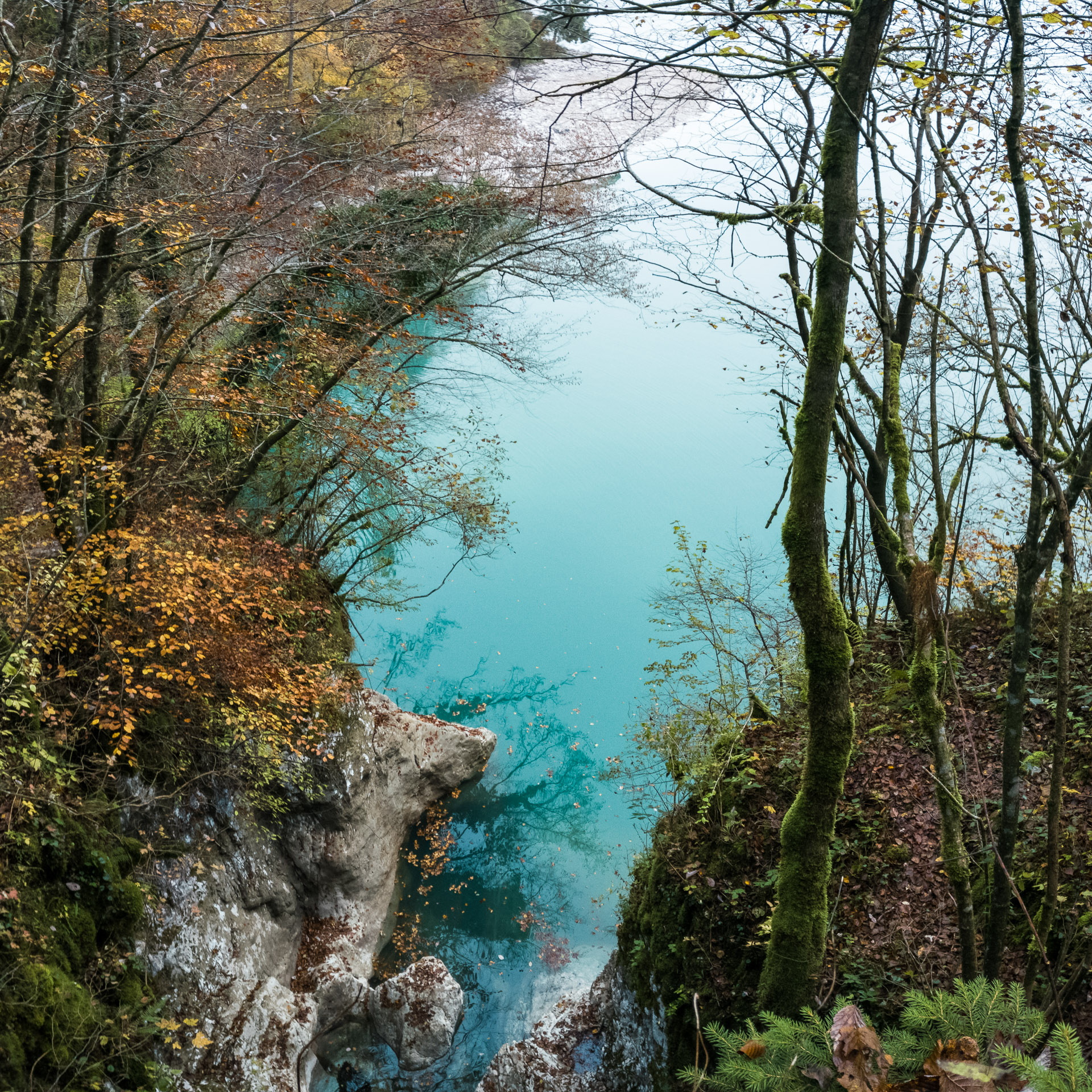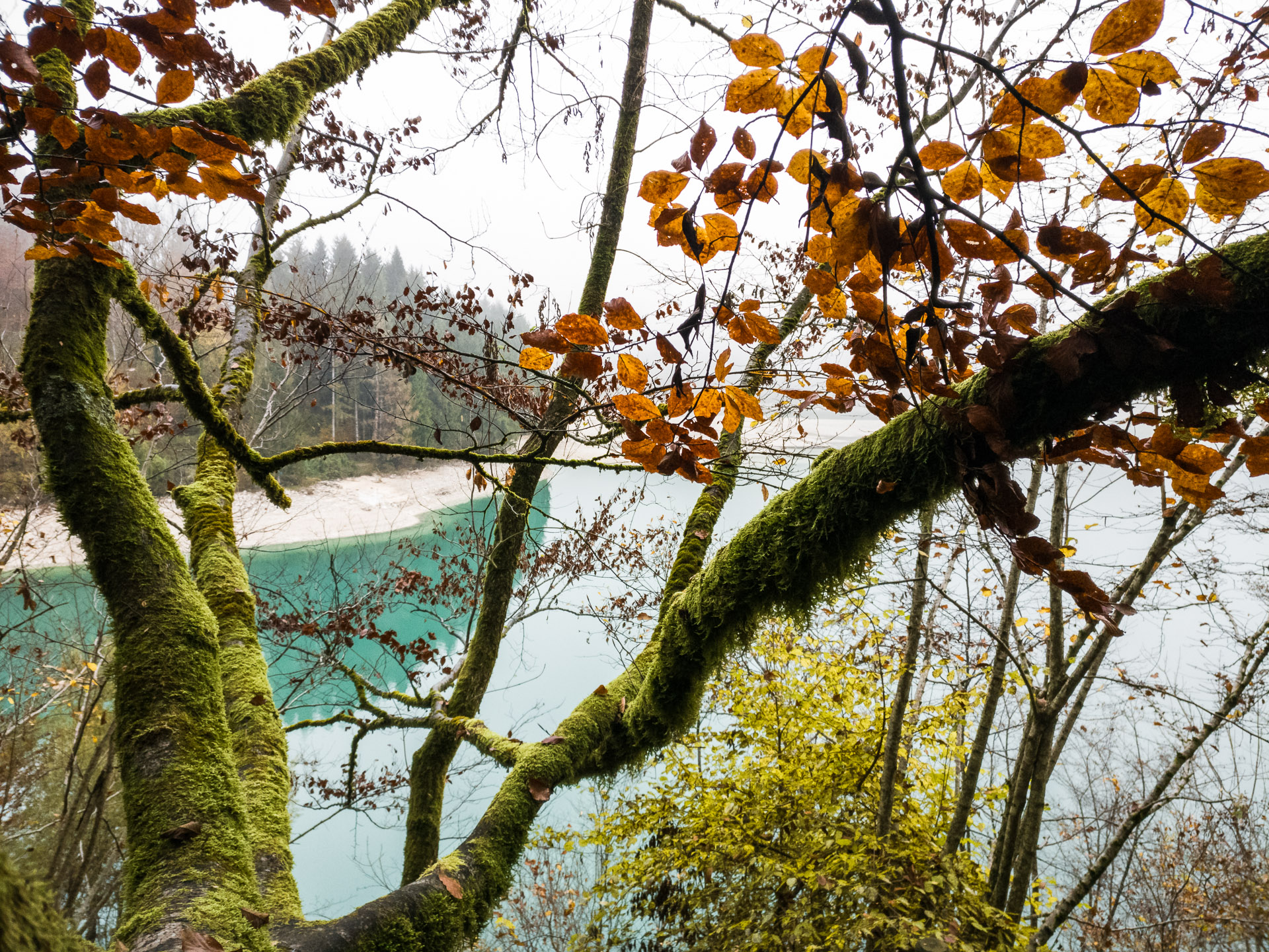 Az aszfaltút kezd eltávolodni a tóparttól, de van egy hívogató turistaösvény, ami közelebb visz a gyönyörű türkizkék víztükörhöz. És micsoda színpompa következik! Szürkésfehér kövek tarkítják a „pirospaprikás” avar-szőnyeget, melyből rikító zöld moharuhába bújt fatörzsek törnek a narancssárga leveleikkel teleszórt ég felé. Sietnem kellene, de nem tudok. Képtelenség itt hagyni ezeket a képeket – melyeket amúgy az új „fényképezőgépemmel”, egy lelkesítően nagyszerű OnePlus 3-as telefonnal örökítek meg (természetesen RAW formátumban).