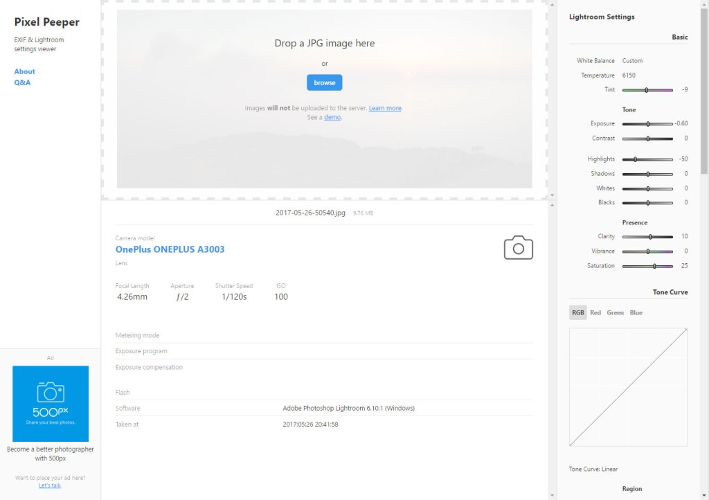 Pixel Peeper – csak rádobod a képet, és máris láthatod az EXIF adatait, és hogy milyen Lightroom beállításokat alkalmaztak hozzá.