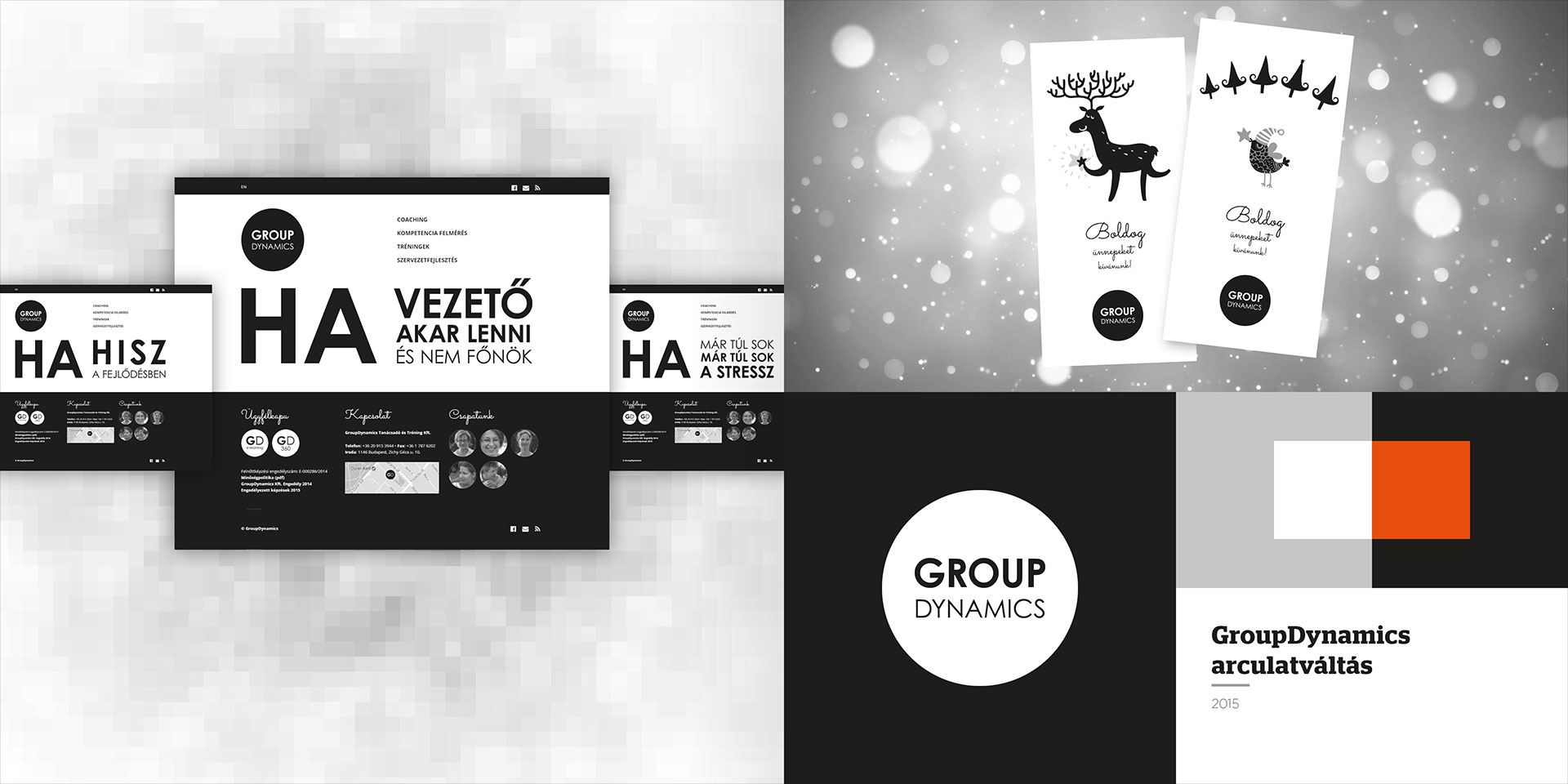 A GroupDynamics kedves csapatát van szerencsém másfél évtizede az elégedett ügyfeleim között nyilvántartani. 2015-ben ismét egy olyan feladattal bíztak meg, amivel azonnal tudtam azonosulni: cseréljük le a korábbi arculatot valami egészen egyszerű, fekete-fehérre. Csodás! Lelkesen láttam neki az „egyszerűsítő-színtelenítő hadműveletnek”.