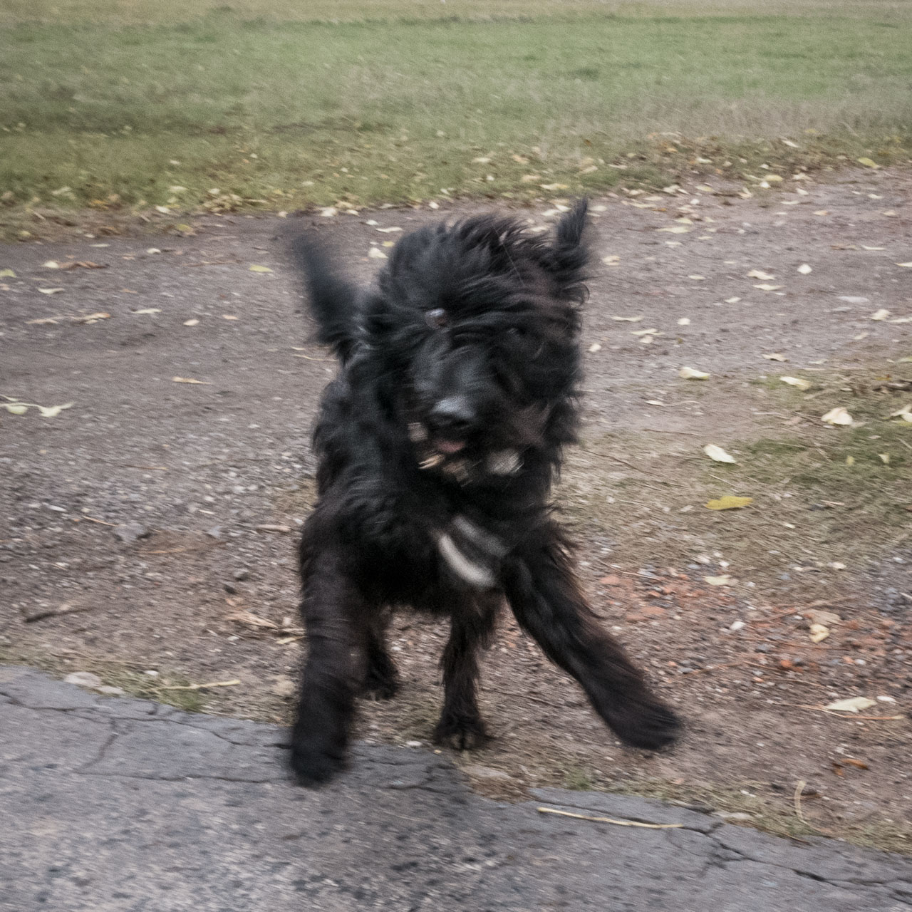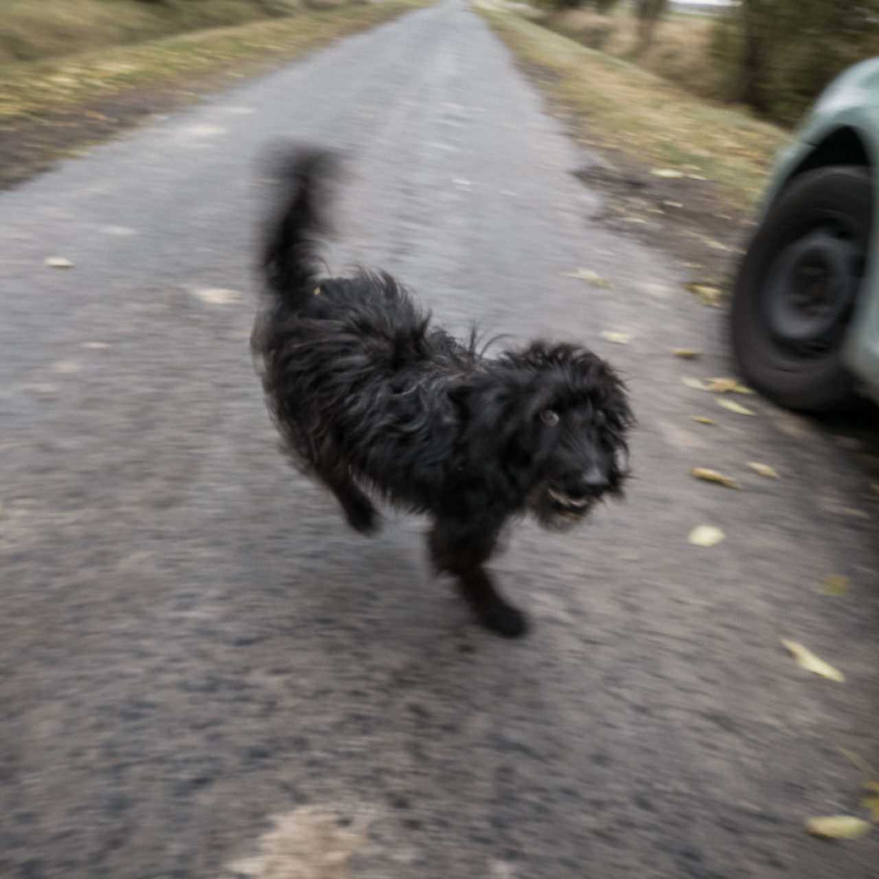 Az autóhoz visszaérve nyújtás közben váratlanul ott terem egy kis fekete loncsosság a köszöntésemre – kétségtelenül ünnepelni jött, örülni a megnyilvánult létnek, annak, hogy van aki megsimogassa, akire felugrálhat, és akit nem kell megugatnia.