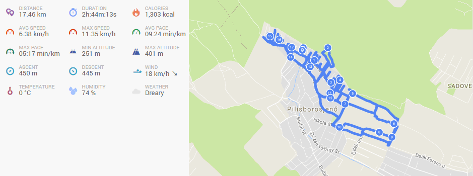 Budapesten, a Pusztaszeri úton is úgy kezdtem, hogy először a környék utcáin szaladgáltam. Már hetekkel ezelőtt megterveztem a „Pilisborosjenő összes utcája” útvonal sorozatot, csak egy héttel később terveztem elindulni rajta. De jobb is így (hisz semmi nincs véletlenül): az első futásaim ezen a gyönyörű helyen induljanak közvetlenül a házunk ajtajától; négy hétvégén át futva fedezem fel Pilisborosjenő összes utcáját – szentedre meg ráér szilveszterkor.