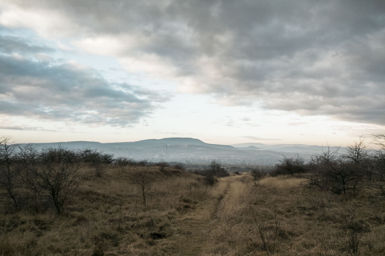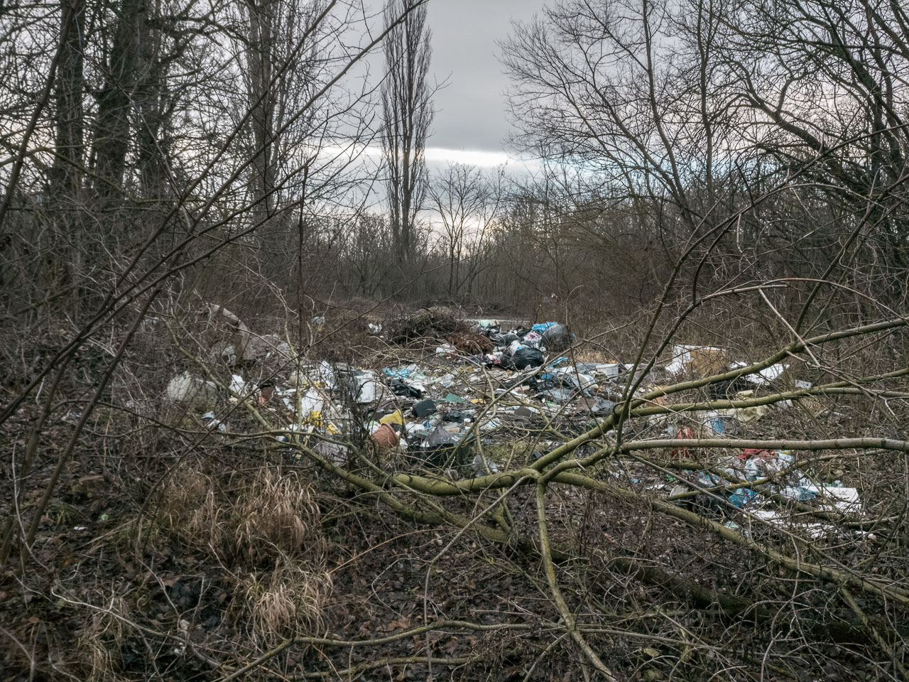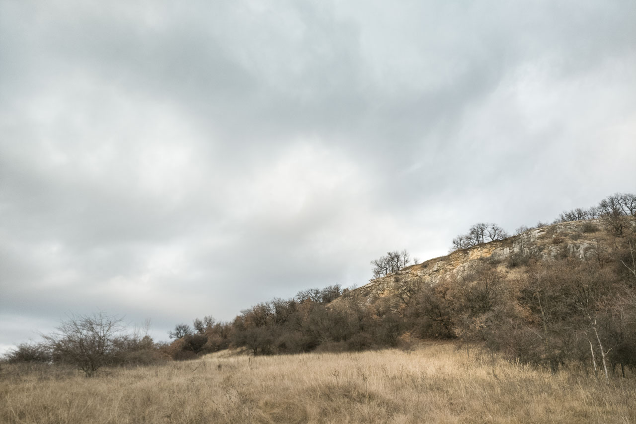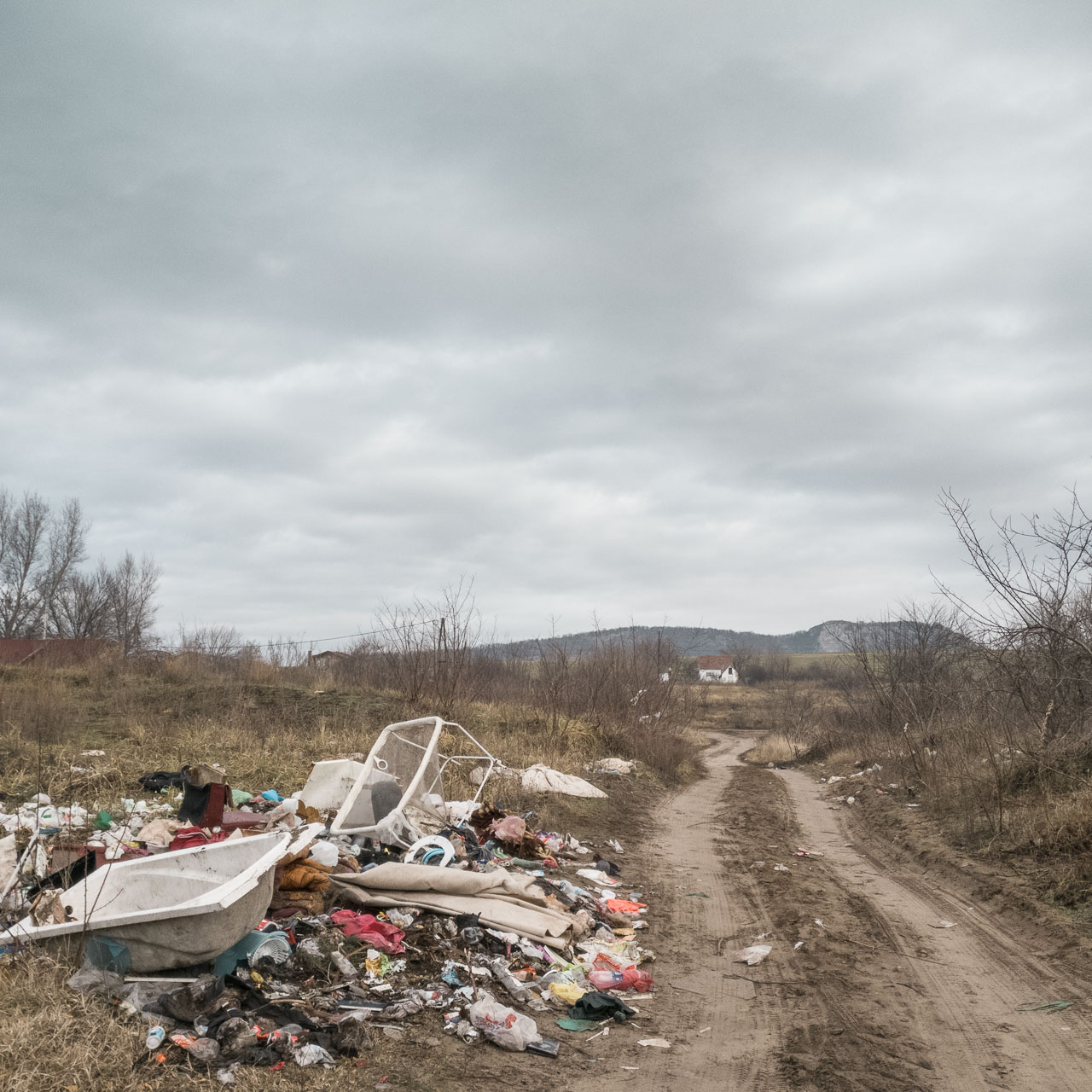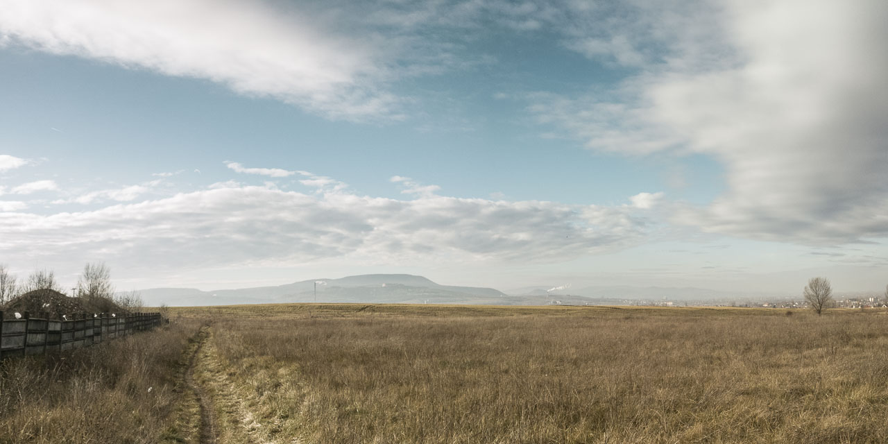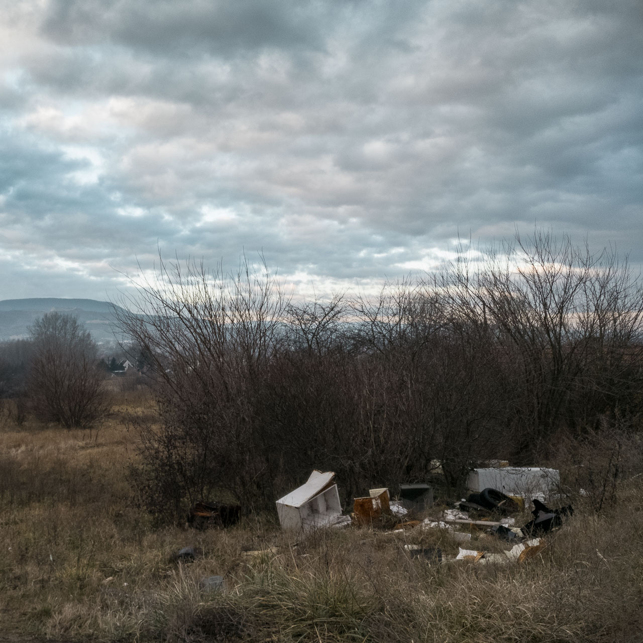 A szemétlerakó telep után, a 117-es út túloldalán egy más világ fogad, itt az ég szürkéi, a fű sárgái és a bokrok barnái színezik a tájat.