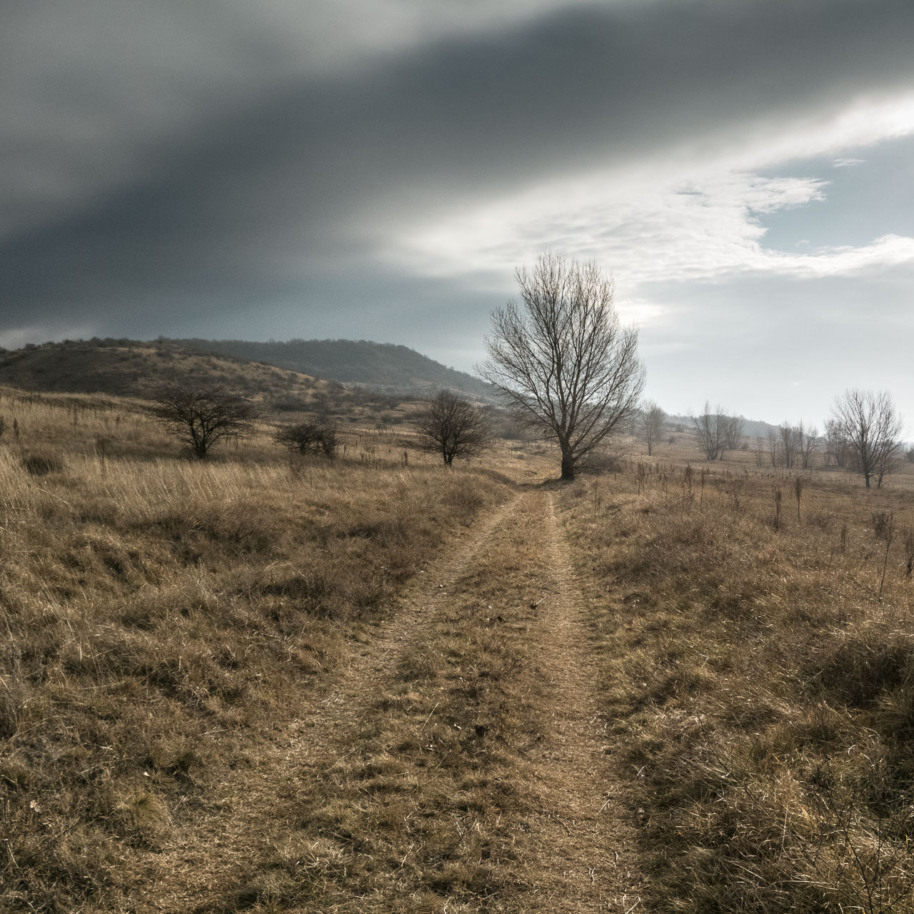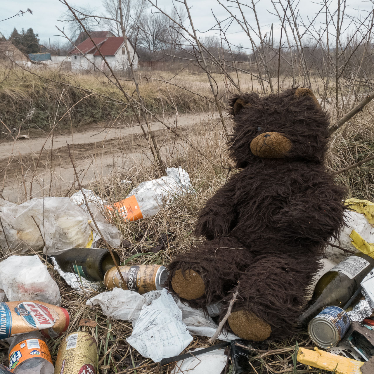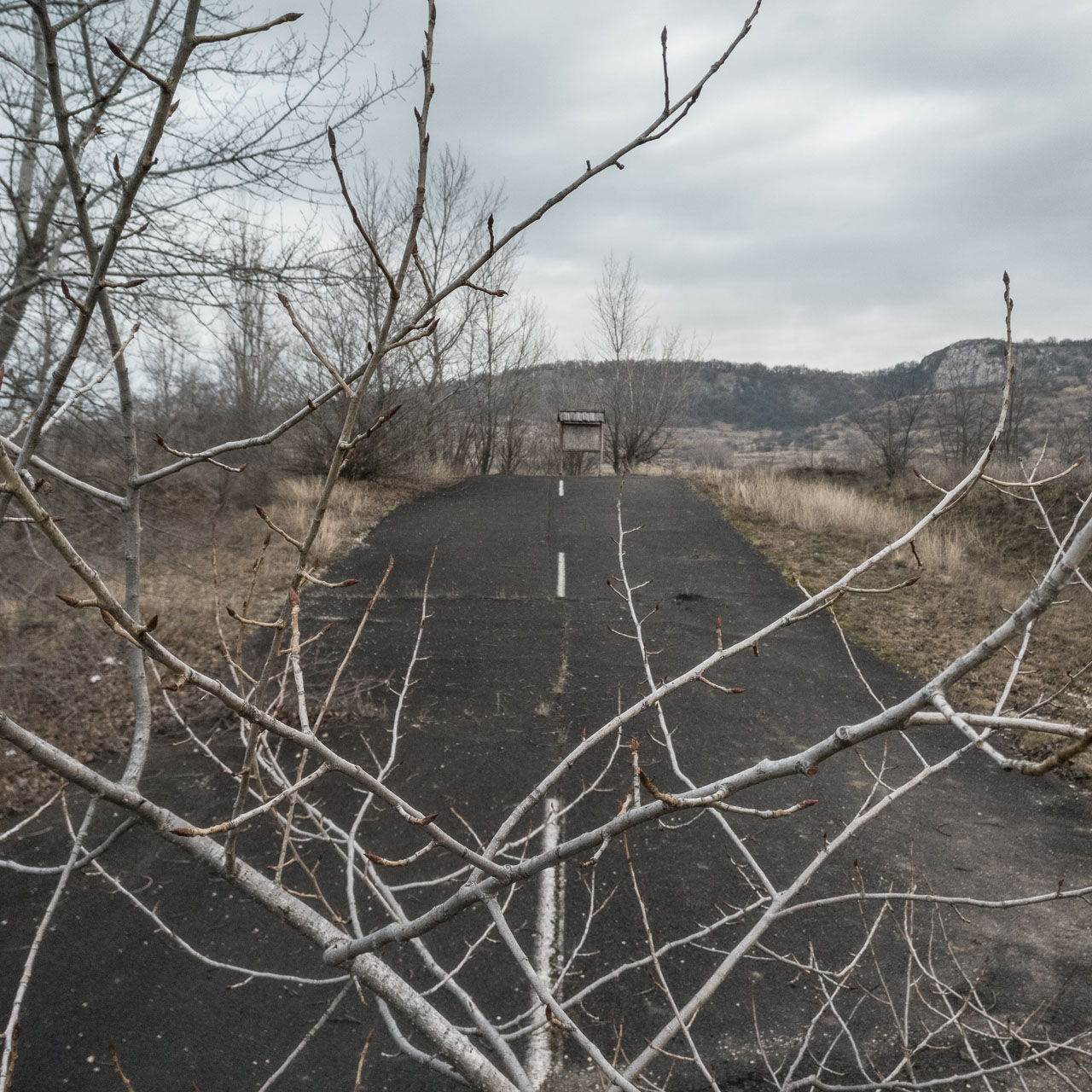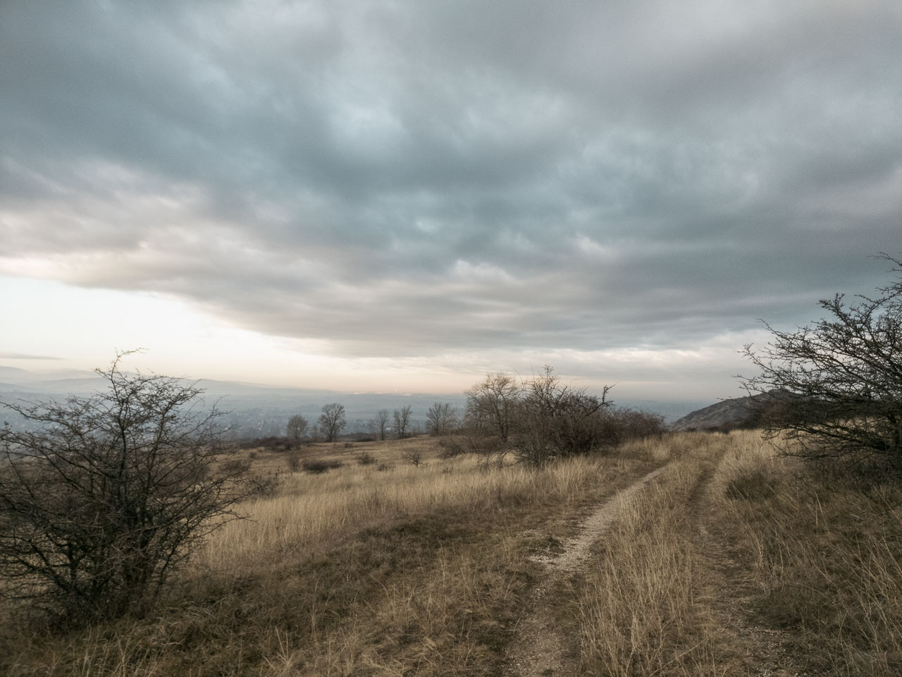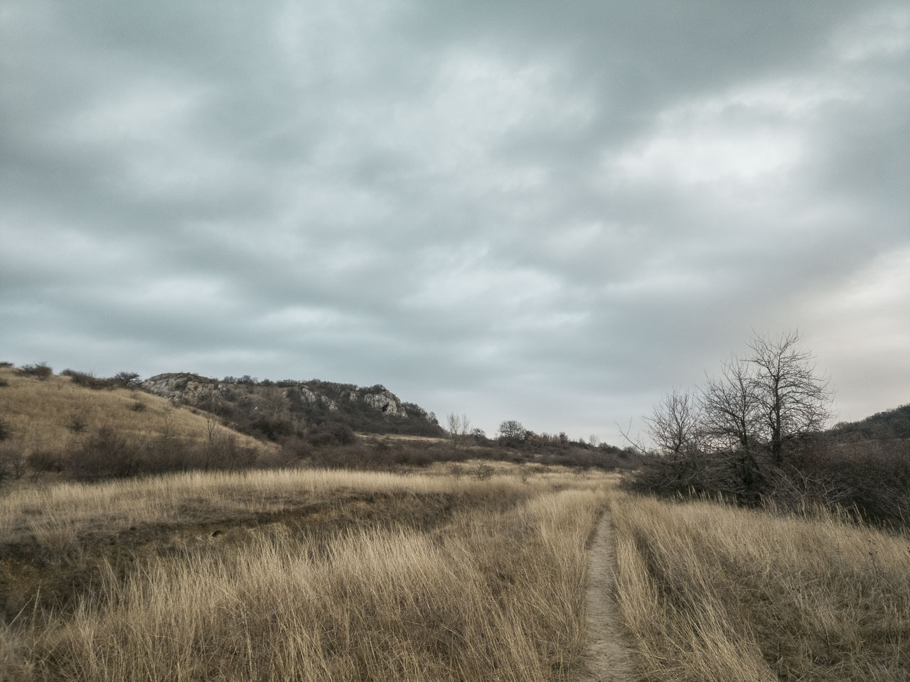A szemétlerakó telep után, a 117-es út túloldalán egy más világ fogad, itt az ég szürkéi, a fű sárgái és a bokrok barnái színezik a tájat.