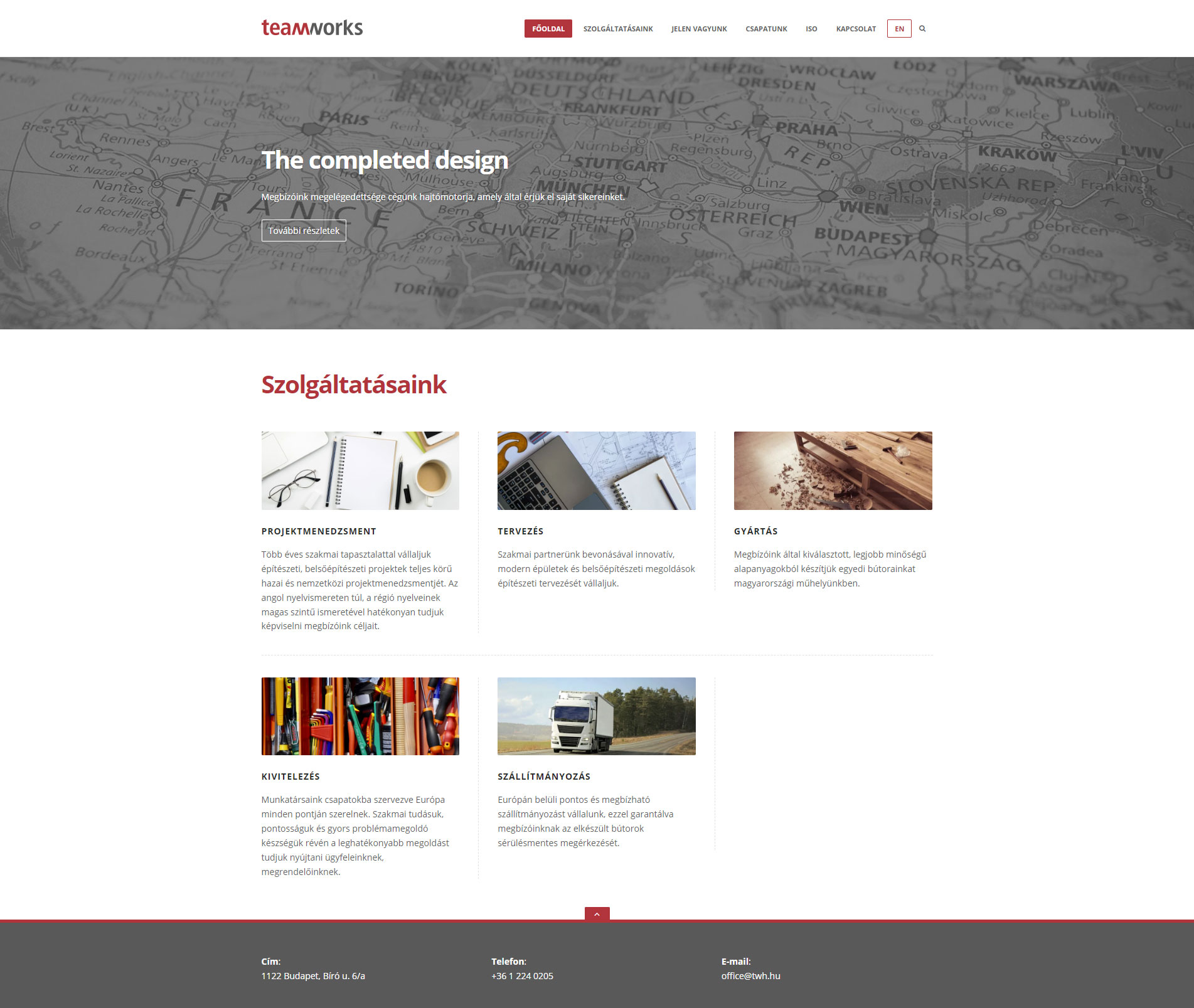 Tavaly ősszel készítettem, de csak most vettem észre, hogy hiányzik innen a webes referenciáim közül a Teamworks szimpatikus csapatának (akkor) új honlapja. Ügyfelem megkeresése után a személyes megbeszélésünkre ugyan ismeretlenül ékeztem, de nagyszerűen egyszerű logójuk azt sejtette velem, hogy könnyen egymásra fogunk hangolódni. Nem is okoztunk csalódást egymásnak, gördülékenyen zajlott a munka, melynek eredményeként megszületett ez a WordPress alapú, kétnyelvű weblap.