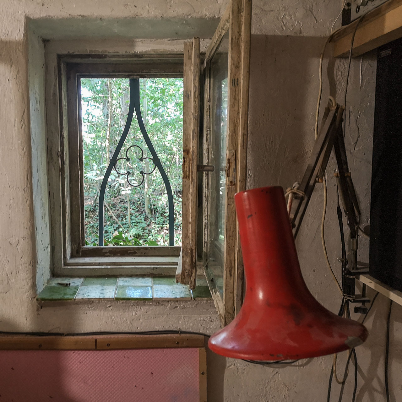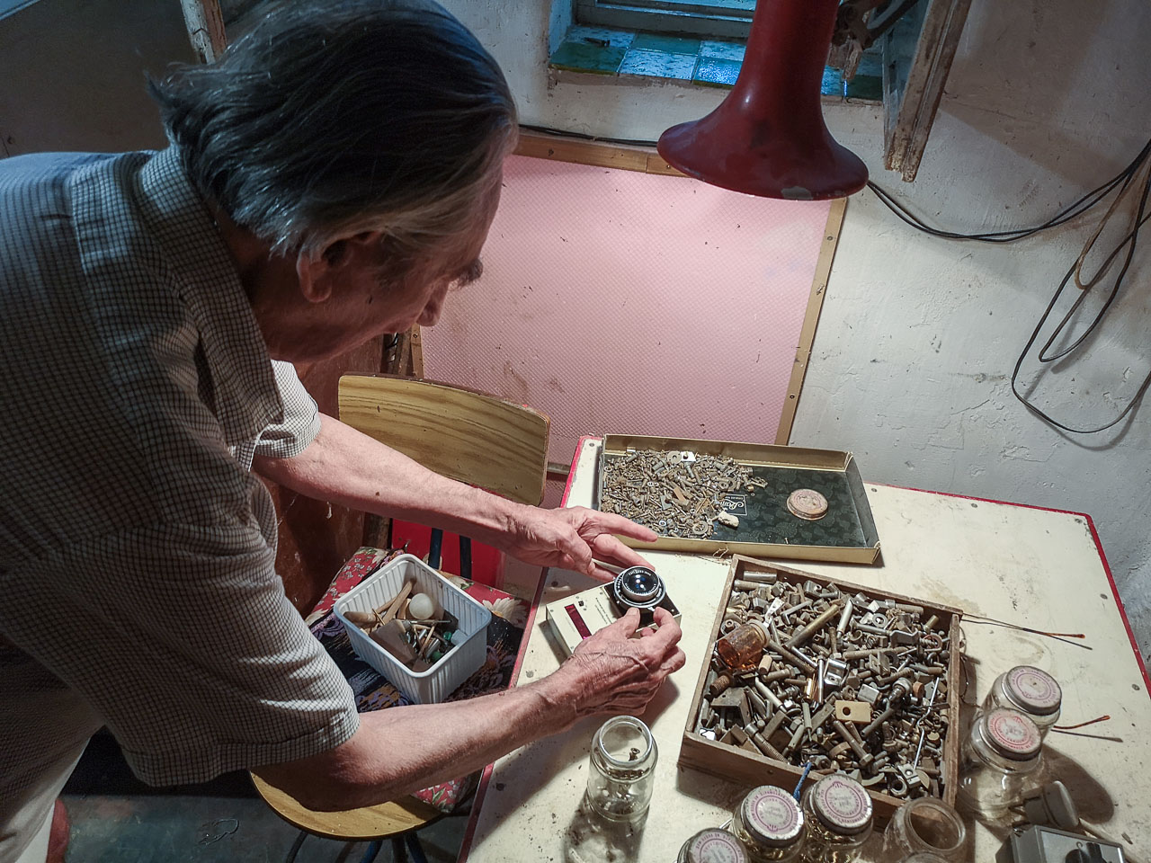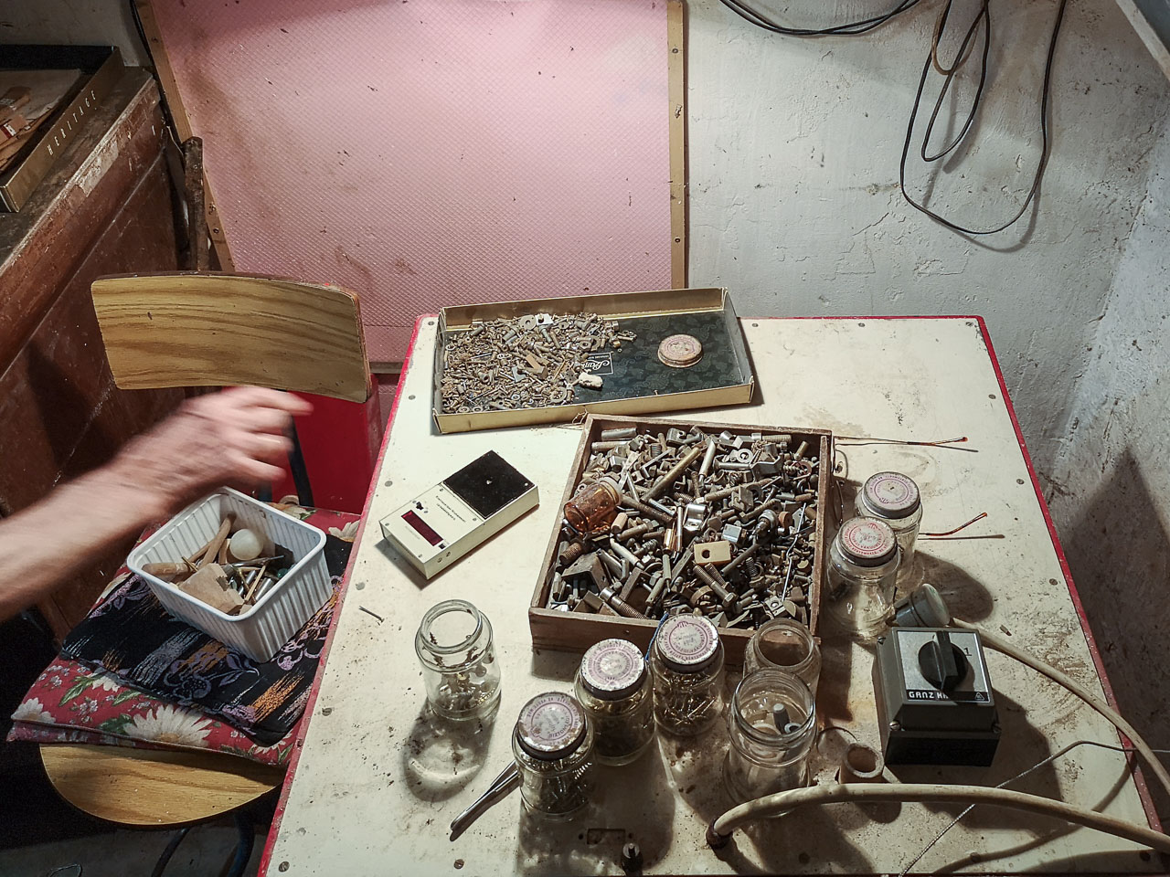 Kérdezi ráérek-e, és miután megborotválkozik, megmutatja műhelyét a kemencékkel, a festékszóróval, a zársebesség mérővel, és még ki tudja mi mindennel együtt – ami mind-mind saját készítésű!