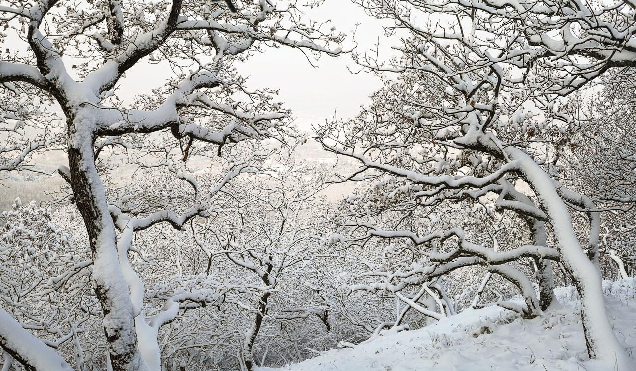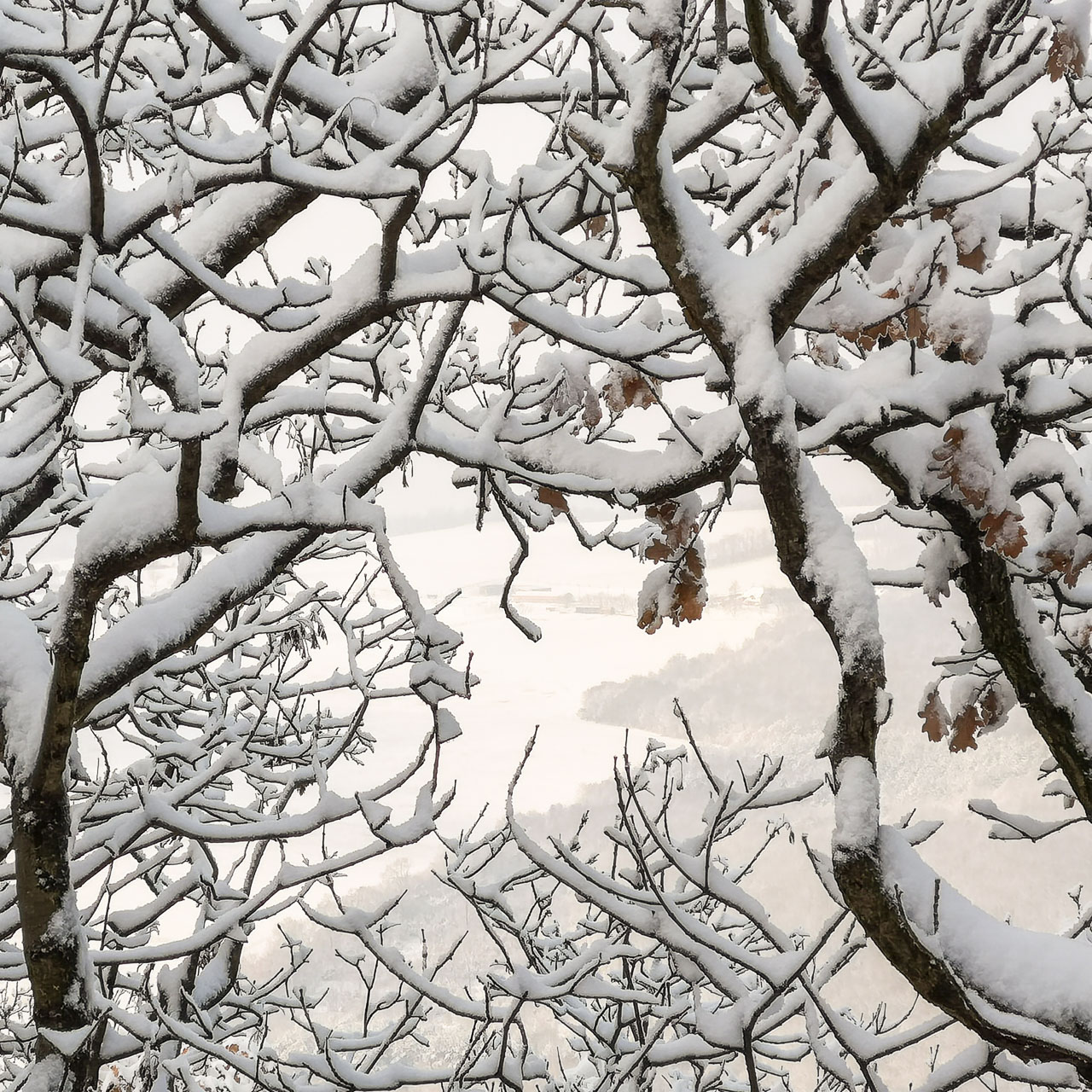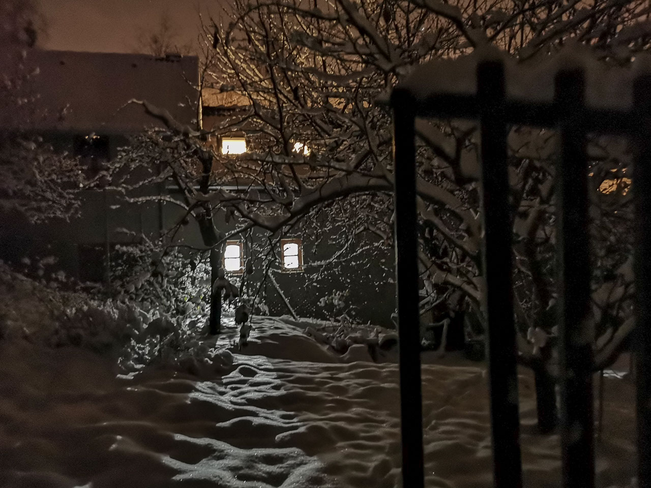 Havas, csúszós az út, ezért tegnap lent hagytam az autót, és így most gyalogosan találkozhatok – házunktól egy kőhajításnyira – ezzel a megejtő látvánnyal; melyben a bent meleg fénye találkozik a kint hideg sötétjével: