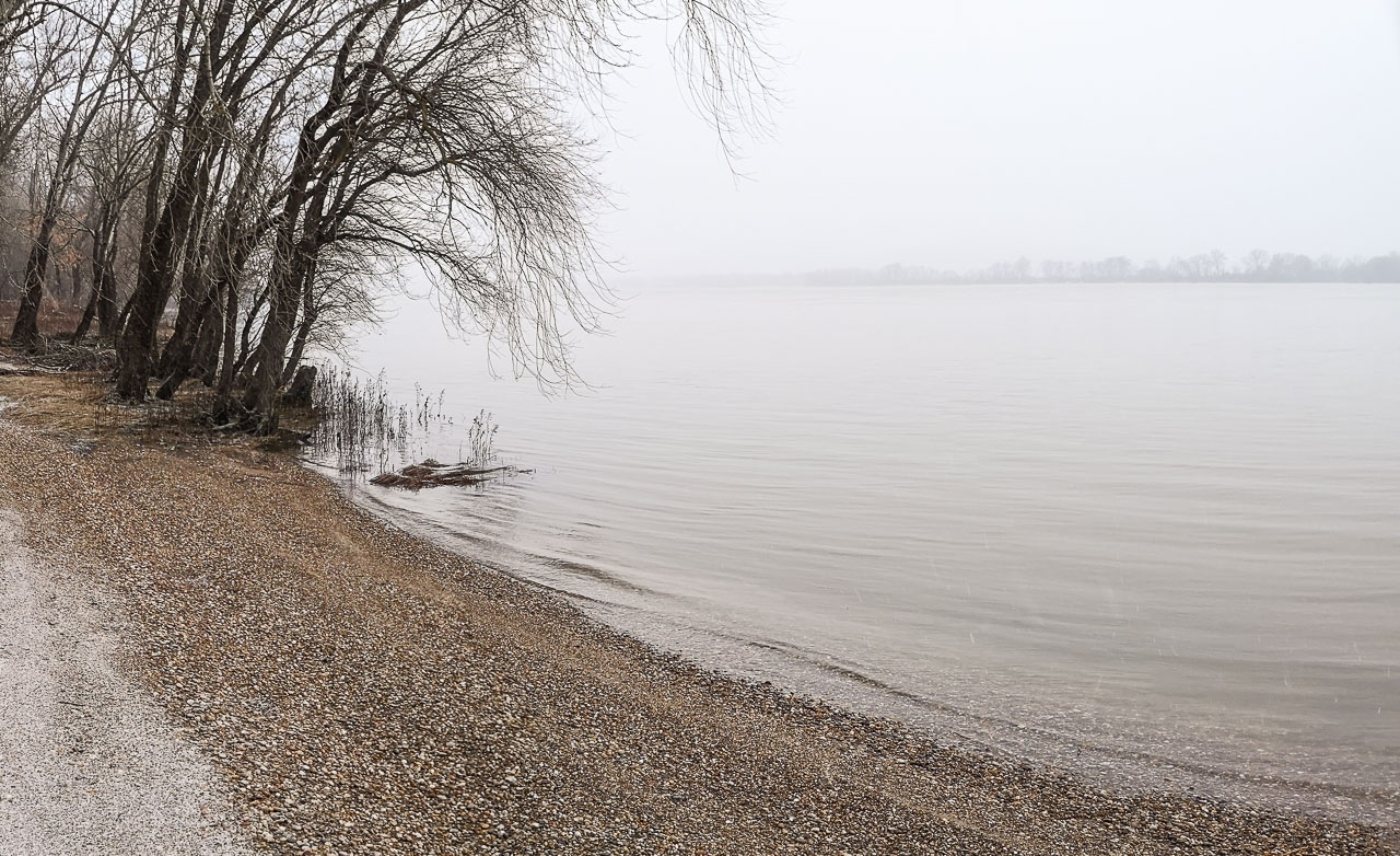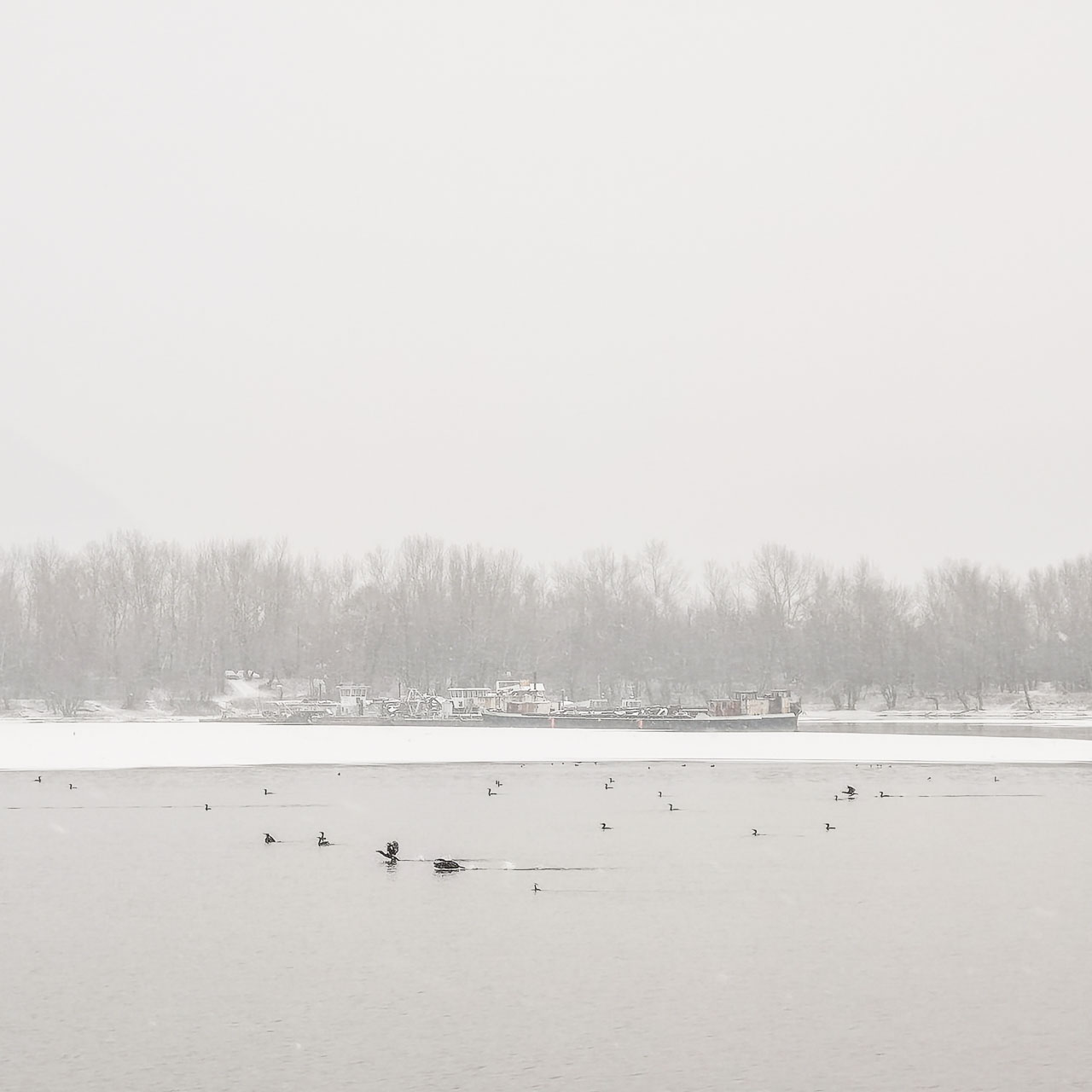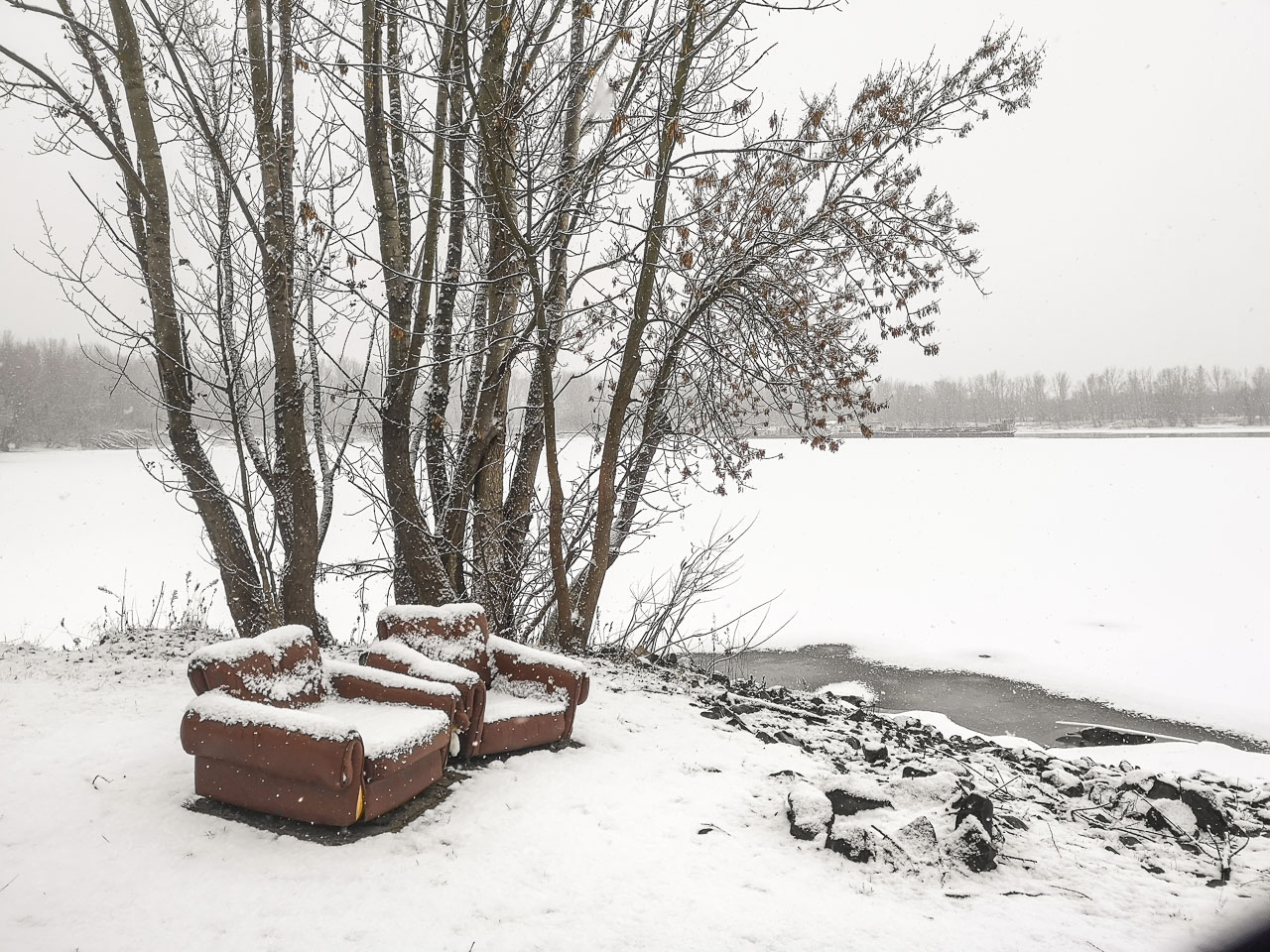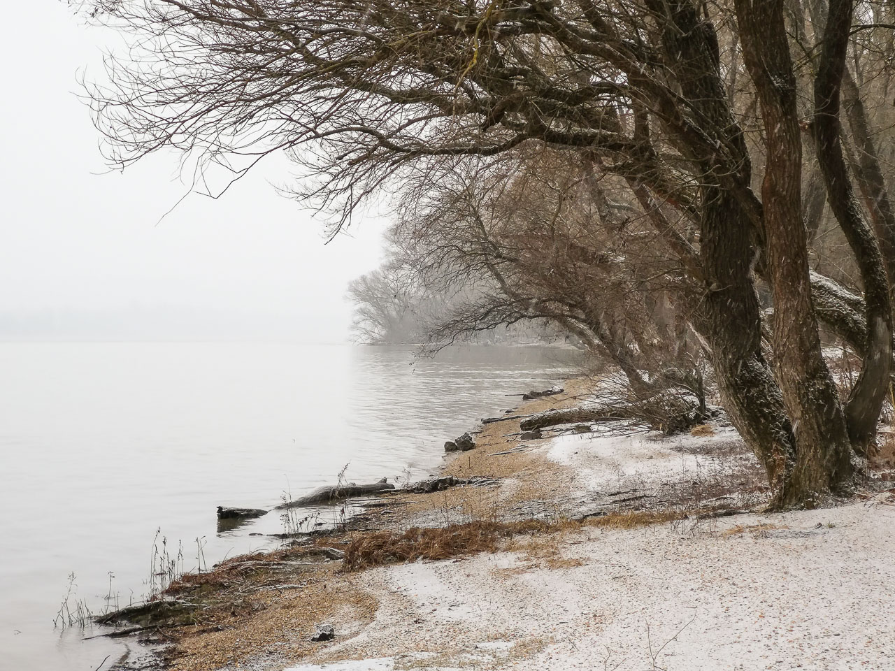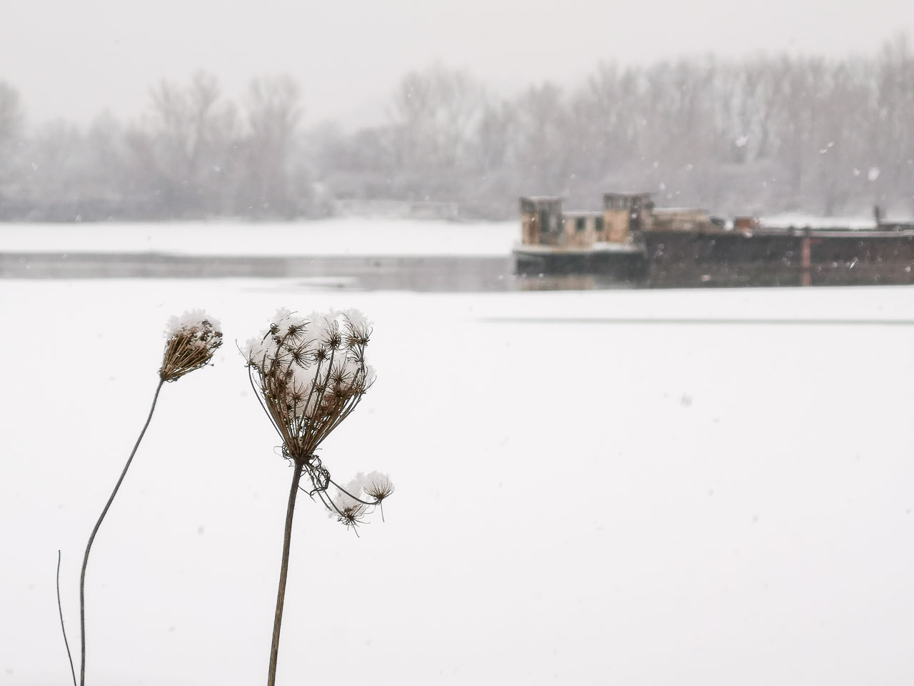 A víz mintha besűrűsödött volna: lassú, lomha hullámokkal vetődik partra. Jó hallgatni a csobbanásait, megállva ebben a hópelyhekkel takart lassúságban.