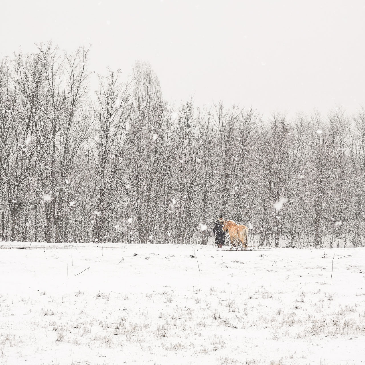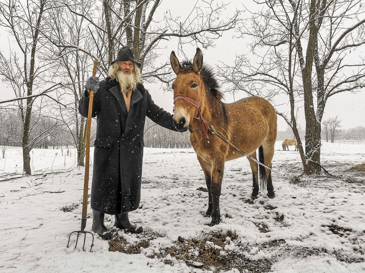 Bemutatja különlegesen szép öszvérét – és én elfogulatlanul is megállapítom, hogy tényleg gyönyörű! Két hónapos korában elpusztult az anyukája, ezért nagyon kötődik az emberhez. Örömmel simogatom a nyakát, ahol nem vizes a hótól.