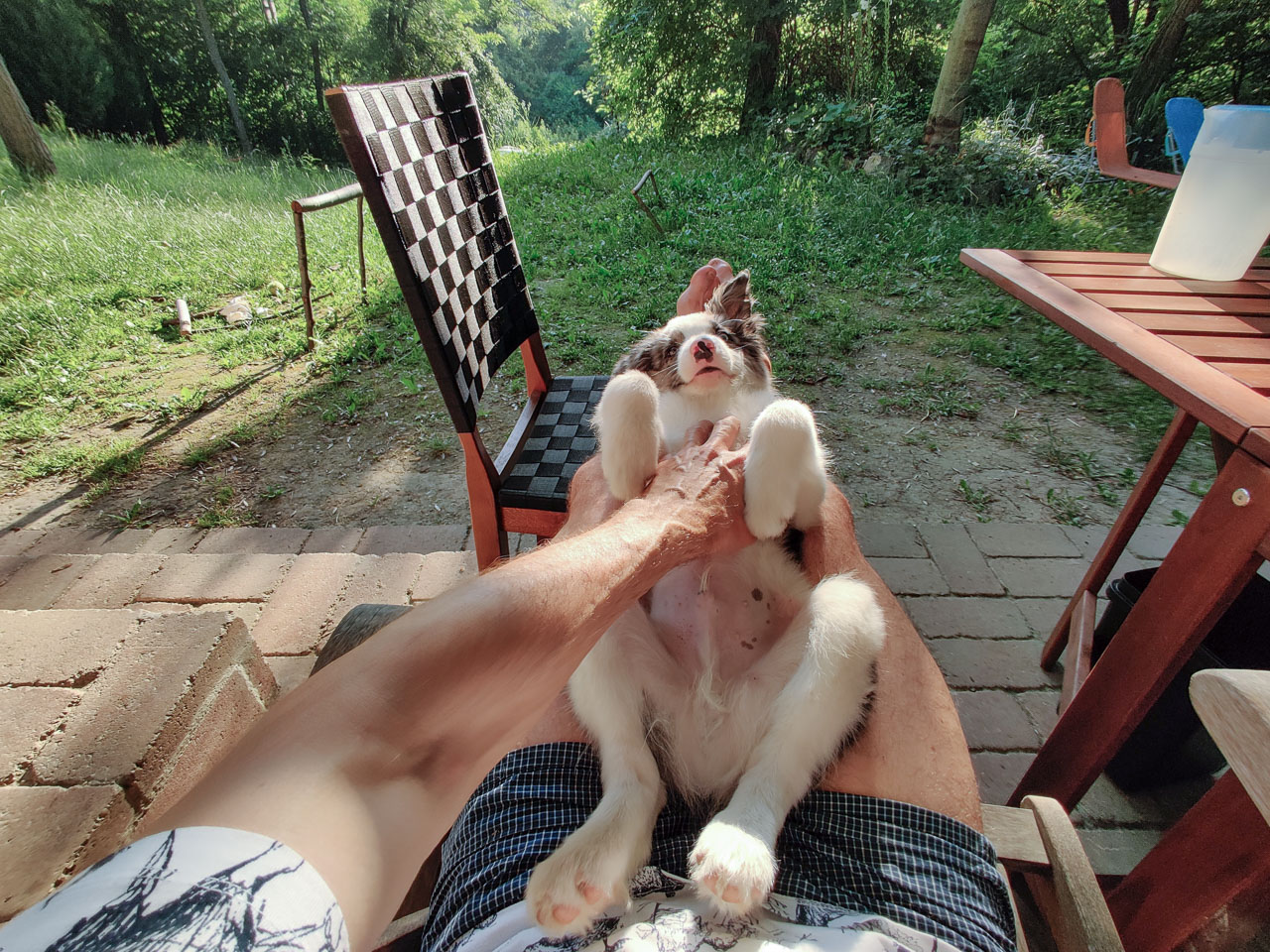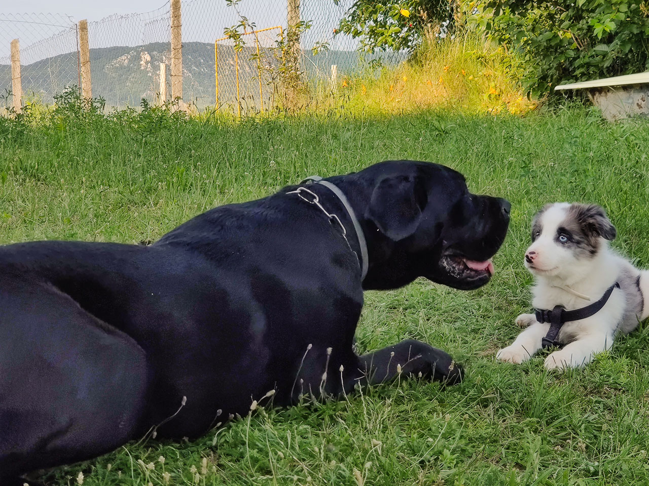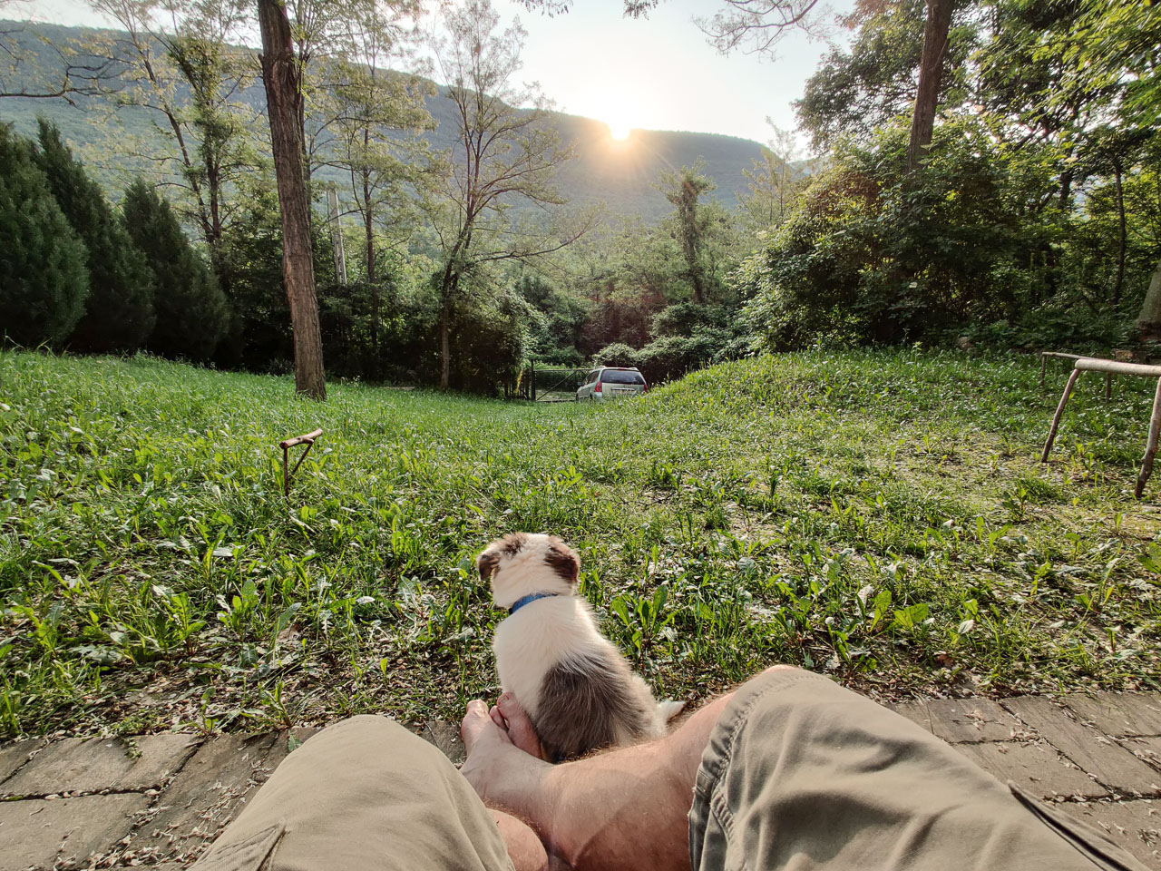 Cimbivel közel egy hónapja boldogítjuk egymást, és azóta kiderült, hogy mint szinte mindig, ezúttal is minden aggodalmam alaptalan volt. Cimbi kezdetektől fogva figyelmes, fegyelmezett, okos, aranyos – két szóval: tökéletes kutyatárs, kire egyetlen rossz szavam nem lehet. Luca néhány óra alatt megtanította neki az ül, fekszik, piti parancsokat; és második kesztölci napján Cimbi már megértette, mit jelent a „marad”, amikor este elköszönök tőle, és becsukom a ház ajtaját, vagy amikor elmegyek, és a kaput zárom kettőnk közé. Reggel, mikor kinyitom az ajtót, vagy amikor hazajövök, örömében majd’ szétesik (utóbbi esetben rendre be is pisil); és bármikor szólok neki, boldogan rohan egy kis szeretetért. Vagy bármiért, mert odaadó ragaszkodása meghatóan feltétlen. Állandóan lesi a tekintetem, és mindenhova követ. Jó vele lenni, nézni, ahogy alszik, ölbe venni, simogatni, szagolgatni, puszilgatni, néha hagyni hogy összenyaljon és -harapdáljon, etetni, itatni, együtt sétálni, futni (és együtt pisilni a kertben); szóval jó szeretni!