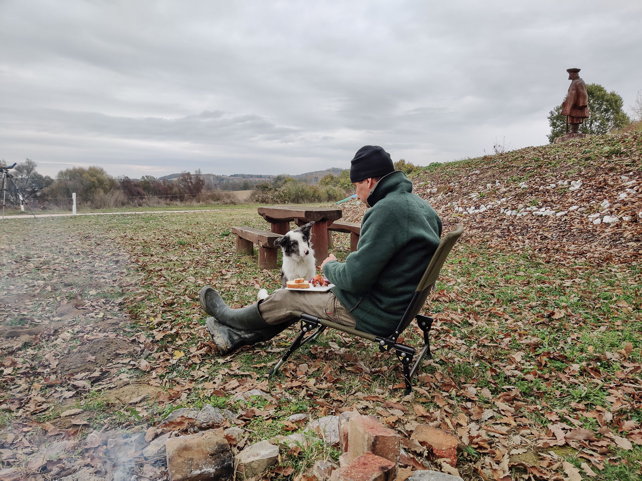 Másnap reggel futottunk egy nagyot, aztán ebéd után elsétáltunk a belvárosba, ezúttal pécsi barátokhoz – természetesen póráz nélkül. Egészen bele a város szívébe, sétálóutcákon át, ahol az emberek az éttermek előtt ülve fogyasztották finoman illatozó ételeiket. Haspók cimborám időnként elkanyarodott az asztalok felé, de ilyenkor csak annyit kellett mondanom, hogy „gyere, megyünk tovább”. Az útszélén, mikor szóltam, megállt, megvártuk, míg elmentek az autók, vagy amíg zöldre váltott a lámpa. Ha kutyával találkoztunk, barátsággal közeledve megszaglászták egymást (ha a másik hagyta), majd folytattuk utunkat. A kidobott ételmaradékokra Cimbi sajnos mindig ráveti magát, de egy (vagy kettő :)) erőteljes „nem” elég, hogy aztán otthagyja.