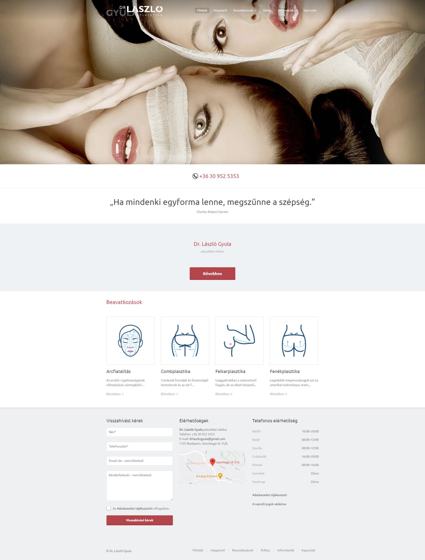 Még 2016-ban kezdtem el dolgozni rajta, aztán – rajtam kívülálló okok miatt – évekig parkolópályára került a projekt, de idén végre publikussá vált a honlap, melyet Dr. László Gyula, plasztikai sebész részére készítettem. A logó is saját munkám.