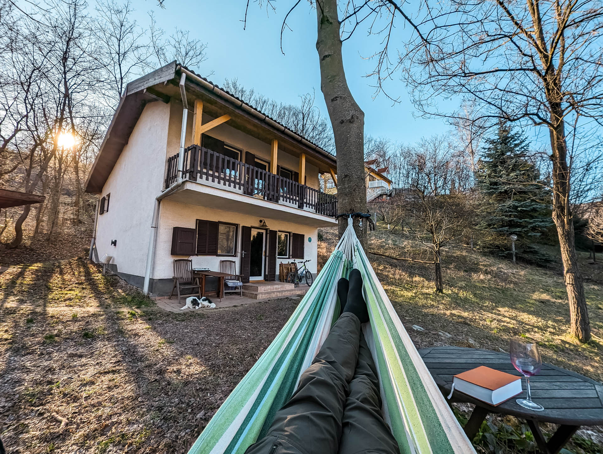 Isten hozott ital, beszélgetések, a környék felfedezése gyalog vagy biciklivel (utóbbi esetben jelezd előre, ha szeretnél kölcsönbringát; Cimbi mindkét esetben útitársunk lesz, és még ha jól is ismered Kesztölcöt, valószínű, tudunk majd újat mutatni a mindenfelé gyönyörű környéken), mezítlábazás, függőágyazás, tollasozás (sikerélményed garantált, amatőr vagyok), napnyugta narancsvörösével festett pilisi hegyoldalban gyönyörködés, madarak, mókusok, békák, bogarak, fák, virágok, növények, Hamvas Béla, csaknézünkkiafejünkből… És persze minden opcionális, semmi nem kötelező.